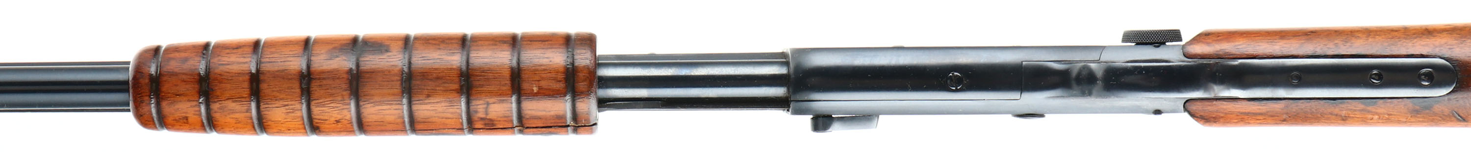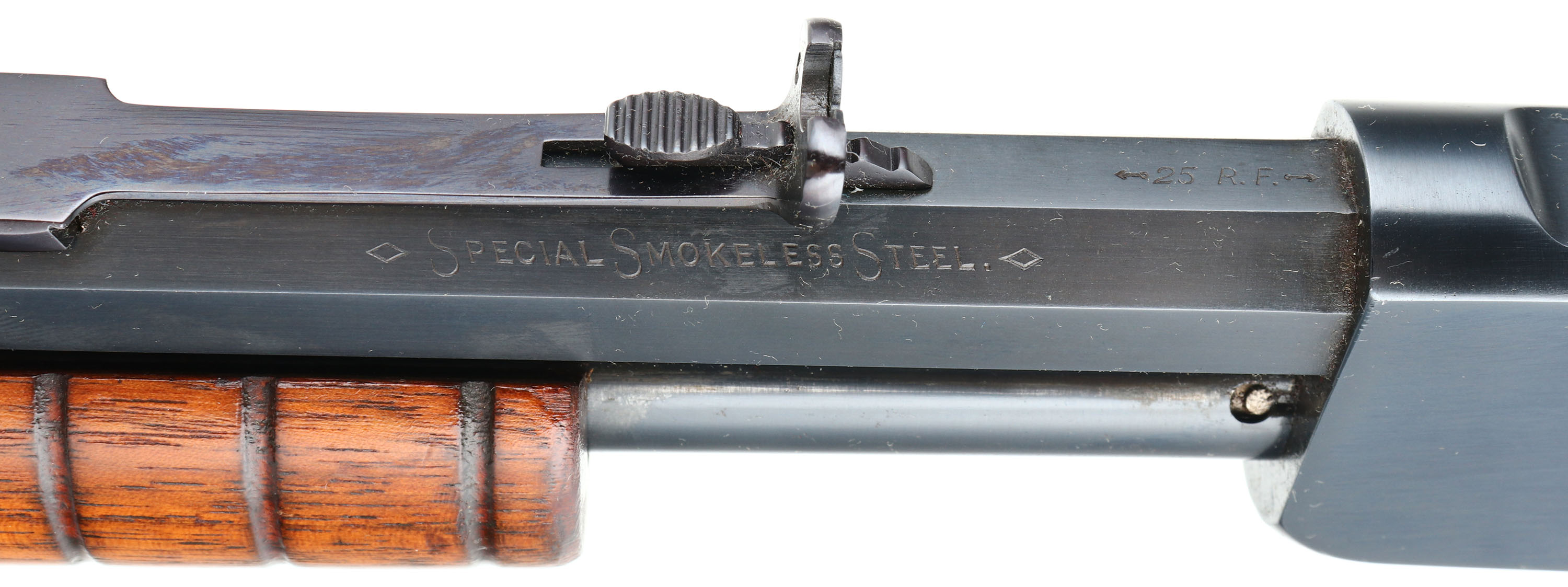 Marlin, Model 27S, CAL: 25 Rim Fire, MFG: 1913-18, SN: None, Pump Action Rifle, 24'' Tapered octagon barrel. The original straight grip wood stocks are good & solid. The stocks have been refinished & there are several remaining minor scrapes & contusions. The forend has a 4'' crack on the left side. The restored metal blue finish rates 98% overall. Bore is good, with some clean roughness amongst strong rifling. The barrel carries an adjustable rear & blade front sights. Stock carries the original crescent metal buttplate. FFL or C&R Req. - Value: 300 to 600