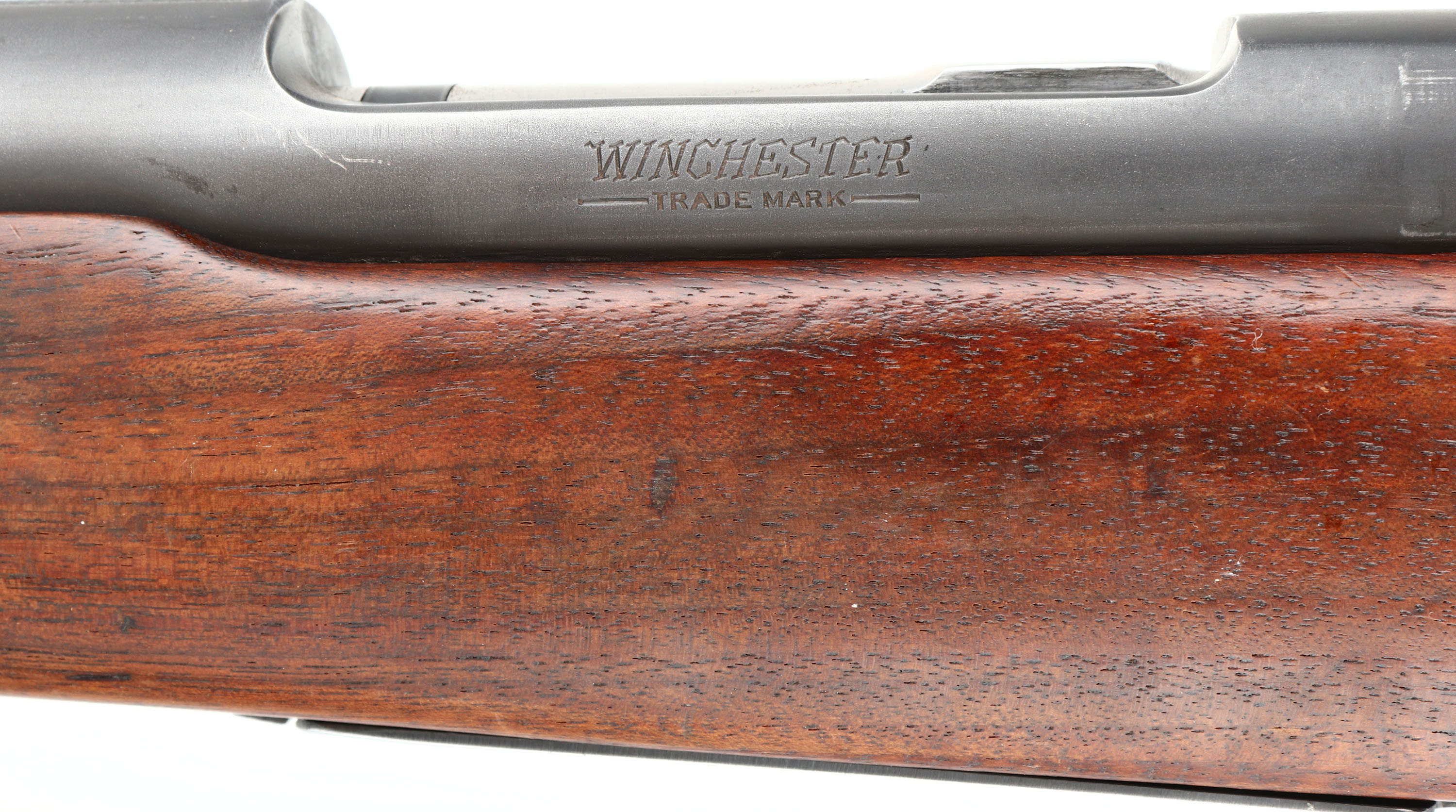 Winchester, Model 70, CAL: 30 GOV'T 06, MFG: 1948, SN: 81382, Bolt Action Rifle, 24'' barrel. The original checkered & flat pistol grip Monte Carlo stock is very good & solid. There is light overall wear, with contusions, scrapes & dings to the original finish. The metal blue finish on the barrel rates 85%. The factory receiver finish rates 95%. Bore is excellent. The receiver is tapped & drilled with (6) open screw holes for scope or receiver sight mounting, (4) on the top & (2) on the left rear side. The barrel has a open rear dovetail & a ramp elevated beaded blade front sight. Rear sling loop present, front sling loop missing. Stock carries a checkered metal buttplate with rust spotting. Stock has been shortened, with a 12'' LOP. FFL or C&R Req. - Value: 500 to 900