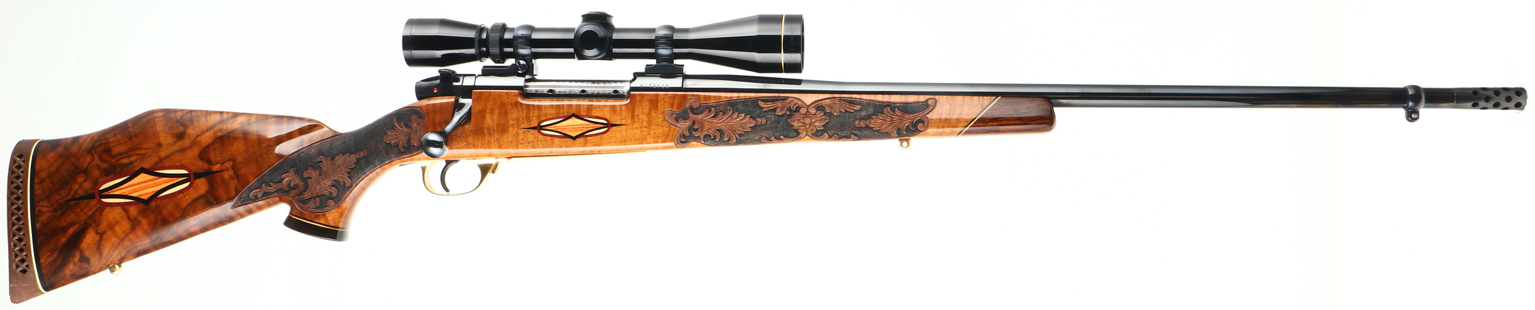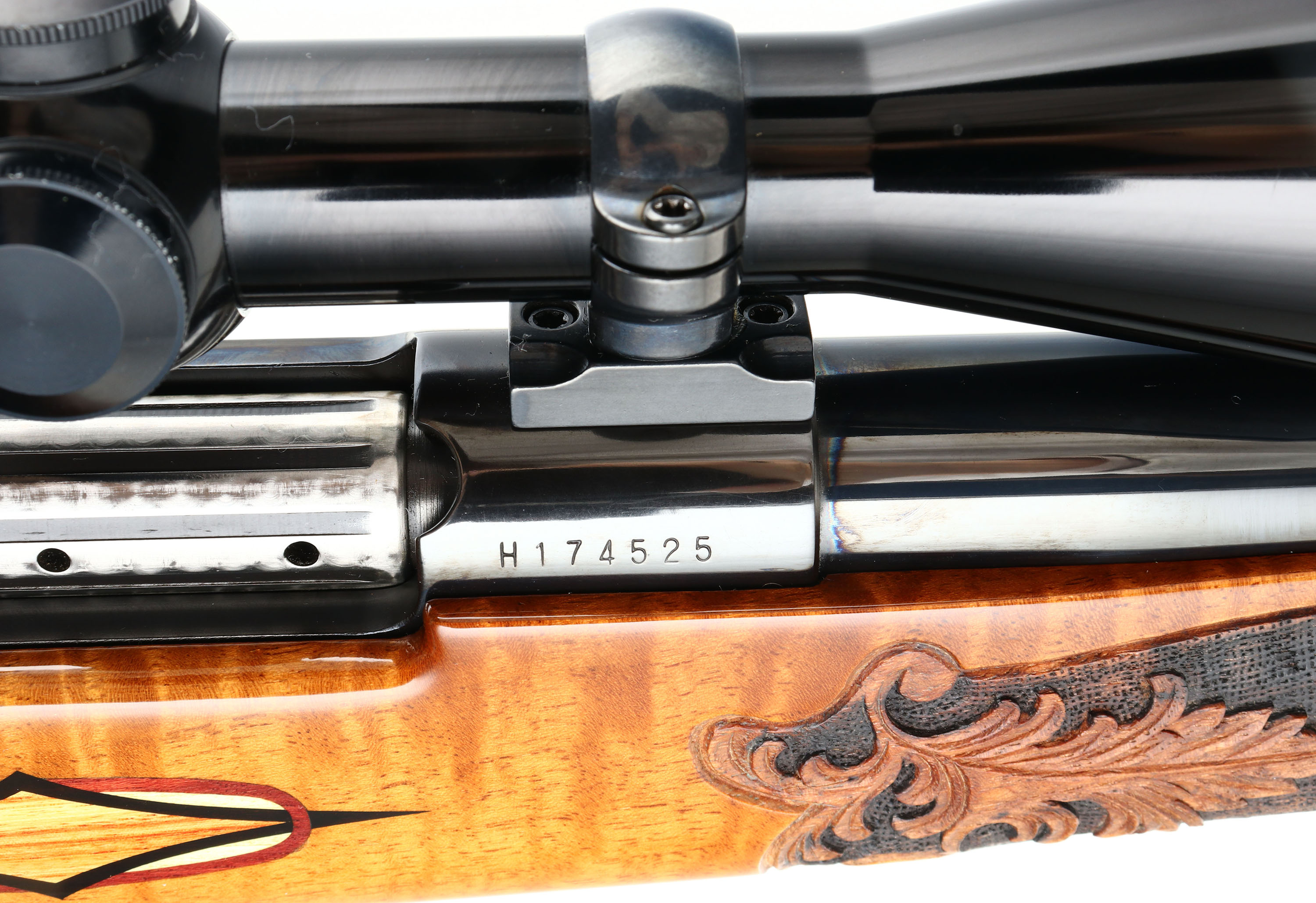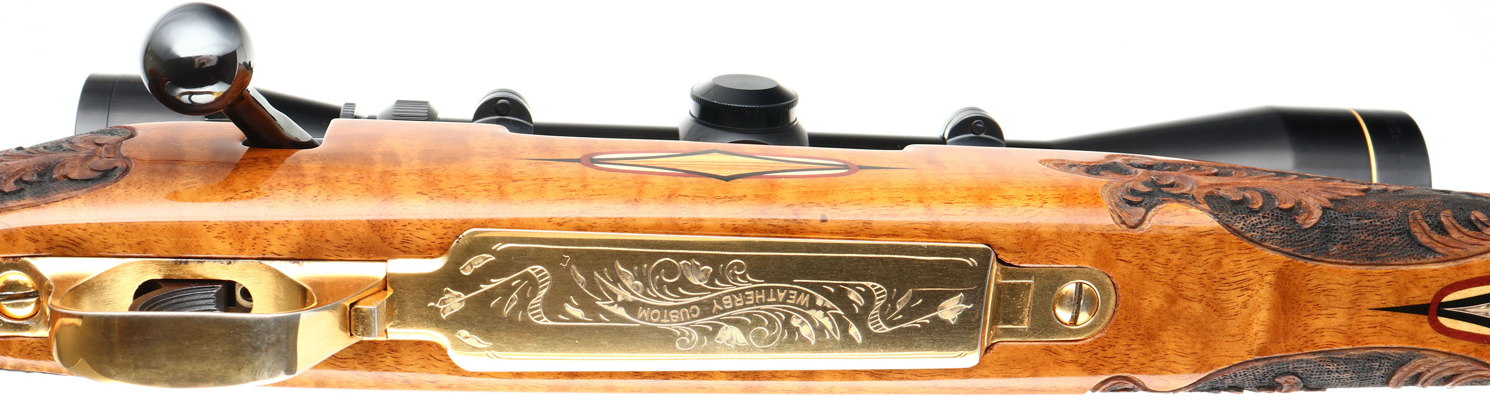 FABULOUS Factory Custom Shop Weatherby Custom Mark V, CAL: 300 Weatherby Mag, MFG: 1972-94, SN: H174525, Bolt Action Rifle, 25'' Tapered barrel, including muzzle break. The stock displays expertly executed & extensive, deep relief scroll leaf carvings & stippled background. The floor plate & inlaid diamond in the bottom of the forearm have beautiful hand accent engraving. The rifle mounted with a very finely figured, cheeked & pistol grip, Monte Carlo stock. The rippled & fiery grain within the walnut stock is fantastic. Stock features 3 layer contrasting rose wood forend tip & grip cap. The stock is nicely inlaid with four multi wood diamond/oval designs, with the one on the underside of the forend also containing the gold metal inscription plate accented with hand engraving. The original high gloss finish is excellent with only a couple of very minor handling marks. The original high luster metal blue finish is 99%. Bore is nearly mint. Rifle carries a Leupold 3x9 Vari-XIIc Scope, no open sight provisions. Buttstock carries a Weatherby, ventilated, brown rubber recoil pad. Jeweled bolt. Sling studs. This fabulous custom shop Weatherby is an example of their finest hand craftsmanship & is highly collectible as a true work of art. FFL Req. - Value: 4000 to 6500