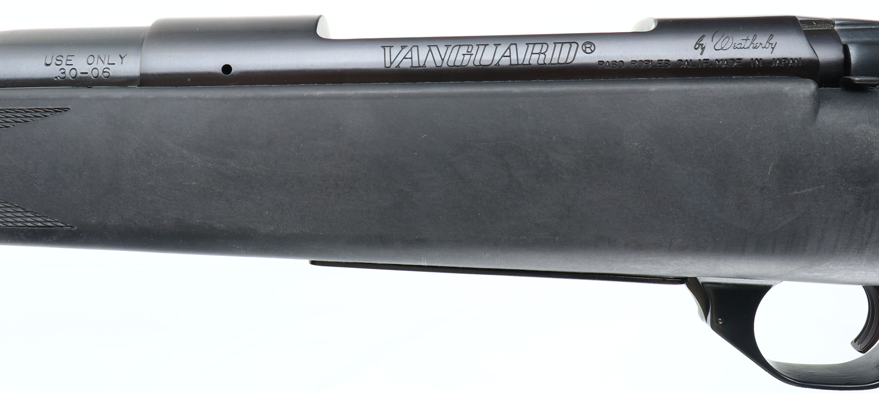 BOXED, Weatherby Vanguard, CAL: 30-06, MFG: Modern, SN: VS293751, Bolt Action Rifle, 24'' barrel. The Monte Carlo style, raised cheek & flat pistol grip synthetic stock is excellent. The metal blue finish rates 99% overall. Bore is excellent. The receiver is factory tapped & drilled for the mounting of a scope. No open sight provisions. Buttstock carries a factory solid black rubber recoil pad. Sling studs. Comes in original box, with owner's manual. FFL Req. - Value: 500 to 800