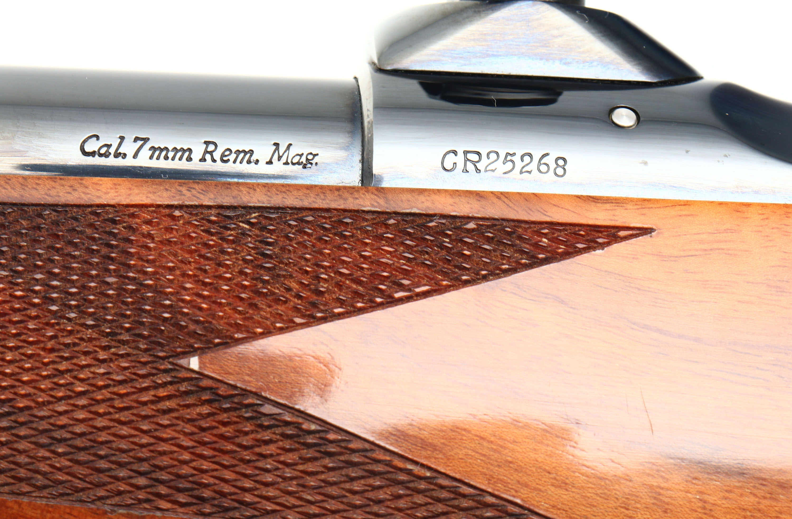 J.P Sauer & Sohn, Colt Sauer Sporting Rifle, CAL: 7mm REM MAG, MFG: 1983-84 (Produced 1971-84), SN: CR25268, Bolt Action Rifle, 23 1/2'' barrel. This rifle was marketed with a single word ''Incomparable''. Produced in W. Germany by J.P. Sauer & Sohn, these high-quality bolt-action rifles were built primarily for the American hunting market & shared specifications of USA-Colt. The rifles were introduced in 1971, saw a 14-year run & faded away in July of '84. The design was unique to the time. To increase operating speed, a Colt Sauers bolt locks up without rotating by utilizing three internally-cammed locking lugs. It is fed by a hefty steel single-stack magazine with the brand & caliber neatly engraved on the face of the follower. Colt Sauers are fitted with high grade American walnut stock with 18-line hand checkering & a high-gloss lacquer finish. A rosewood forend & grip cap add to the asthetic. The original checkered, capped & beaded cheek Monte Carlo style stock is excellent. The factory high-gloss finish is excellent. The deep blue metal finish rates 99% overall. Bore is excellent. The receiver is tapped & drilled, holding a pair of Redfield scope rings & bases. No open sight provisions. Sling studs present. Stock carries a Colt Sauer ventilated recoil pad. Original internally marked mag reads ''Colt Sauer 7mm Rem Mag''. These were not rifles made to be dragged through deer swamps or left in the barn. Rather, they were a balance between exceptional hunting performance & the artwork of fine gun builders. High condition, all original examples like this one have become quite collectible & command high values. FFL Req. - Value: 2500 to 4500
