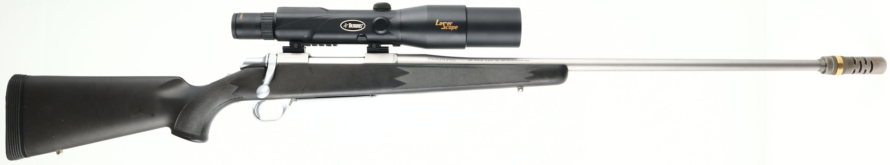 Browning, A- Bolt, CAL: 300 Rem Ultra Mag, MFG: Modern, SN: 42502MZ351, Bolt Action Rifle, 26'' barrel (27 3/4'' w/ muzzle break). The synthetic, checkered & flat pistol grip stock is excellent. There are light handling marks from light use. The stainless steel finish rates 98% overall. Bore is excellent. The receiver carries a Burris Laser Scope 4x-12x. These scopes (when new) retail for around $1000. (Note: If used for hunting, these integrated laser rangefinder scopes are not legal in some states, because of the advantage they provide.) No open sight provisions. Stock carries a LimbSaver solid recoil pad. Sling studs. A ready-to-go hunting rifle, with a fantastic scope. FFL Req. - Value: 1000 to 1500