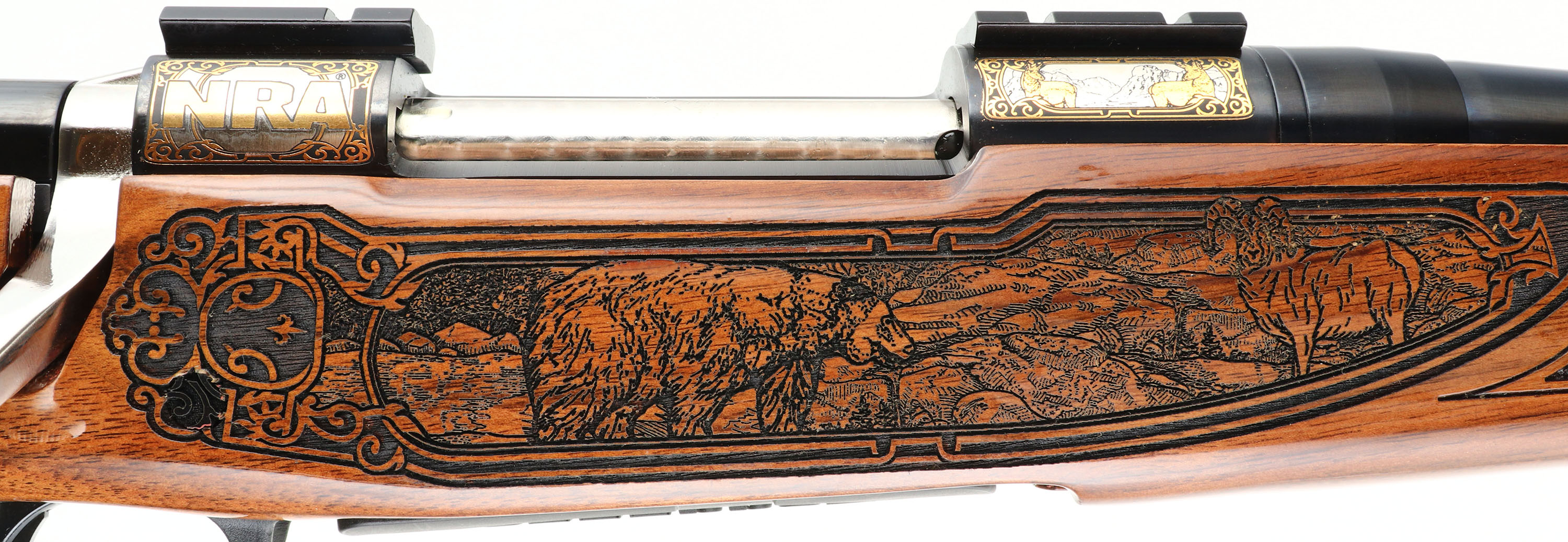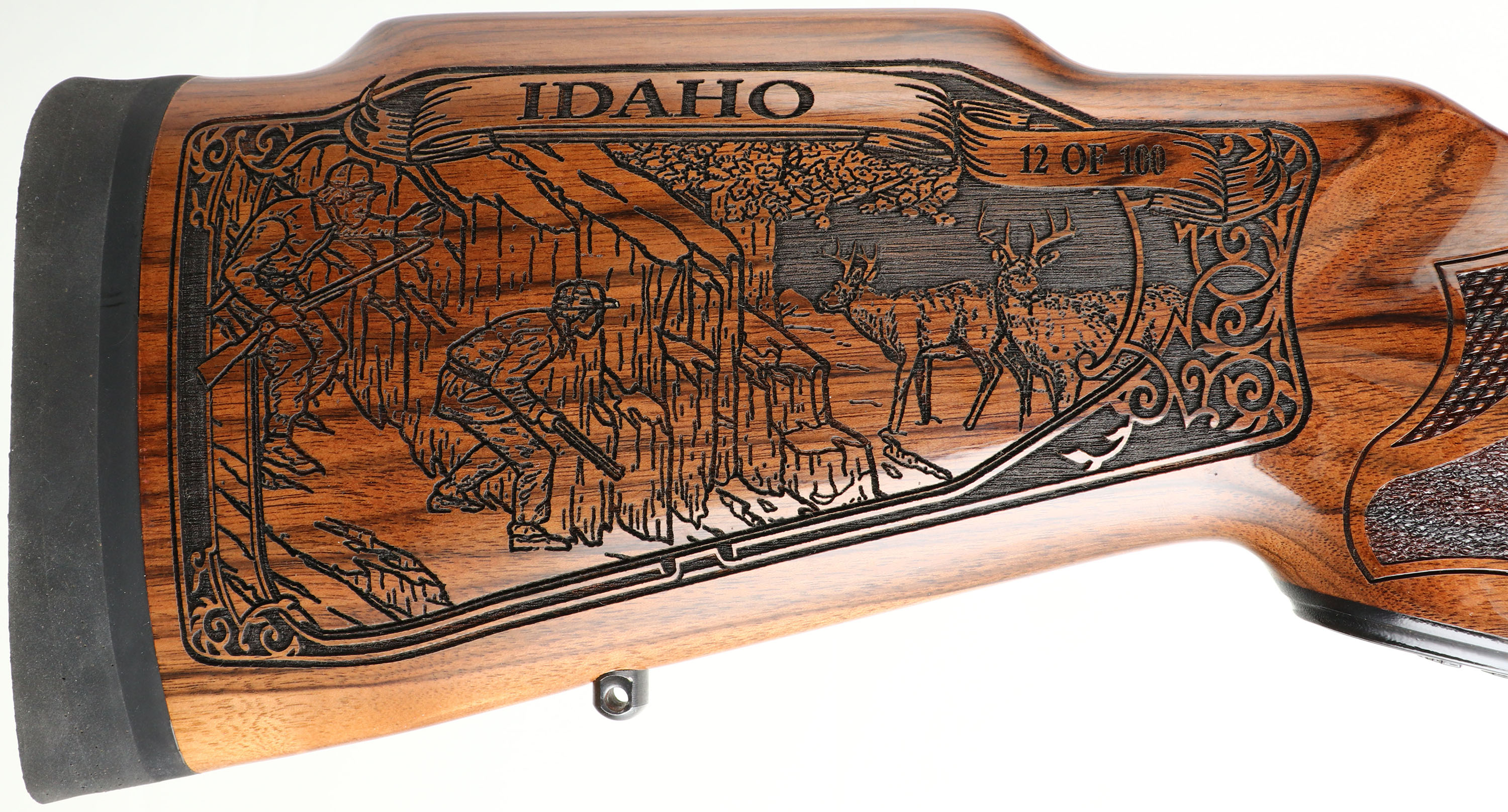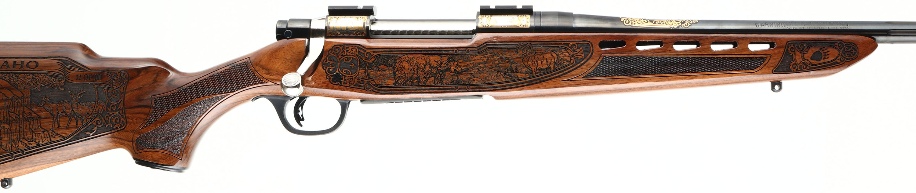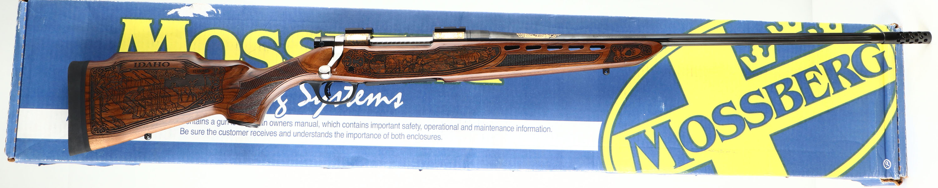 Mossberg, Model 4X4 Hunting Tradition NRA Idaho Commemorative Special Edition, CAL: 300 WIN MAG, MFG: 2012, SN: BA275333, Bolt Action Rifle, 24'' free floating & fluted barrel, 26'' with the muzzle brake. This firearm was a special fund raising edition for the NRA by American Legacy Firearms. There were just 100 rifles produced for each state, this being # 12 of 100 for Idaho. The American-walnut stocks are ornately engraved with wilderness scenes depicting a father & son sharing a hunt of two buck dear. The forearm displays engraved popular North American big-game animals of a bear, ram, deer & moose. The bottom of the fore-end is engraved with ''National Rifle Association''. The engraving on the stock was done by SWS Engraving in Hope, Ark., a plant owned & operated by Hanson. The stock is finished with an extra-durable coating to protect the engraving during normal use. All metal parts, including the barrel & receiver, are buffed, blued, engraved & then plated in gold, nickel or blue, as the design dictates. The left side having cow & bull elk, the right Prong horn & the ''NRA'' in silver & gold. The bolt is nickel-plated and then hand-jeweled. The metal work done by American Legacy Fireworks, Inc. The original checkered. engraved & capped pistol grip walnut stock remains mint. The original metal blue finish remains new. Bore is mint. The receiver holds a couple of scope blocks for future scope mounting, with no open sight provisions. Mossberg solid recoil pad & sling studs. Detachable mag. Steve Faler & American Legacy Firearms have a mantra, ''Life's too short to shoot an ugly gun!'' With these words in mind, they produced this fine NRA Special edition. The rifle comes in the original box, with packaging, booklet & paperwork packet, & Lock. Basically new old stock. These sold for $1795 back in 2012. FFL Req. - Value: 1500 to 2500