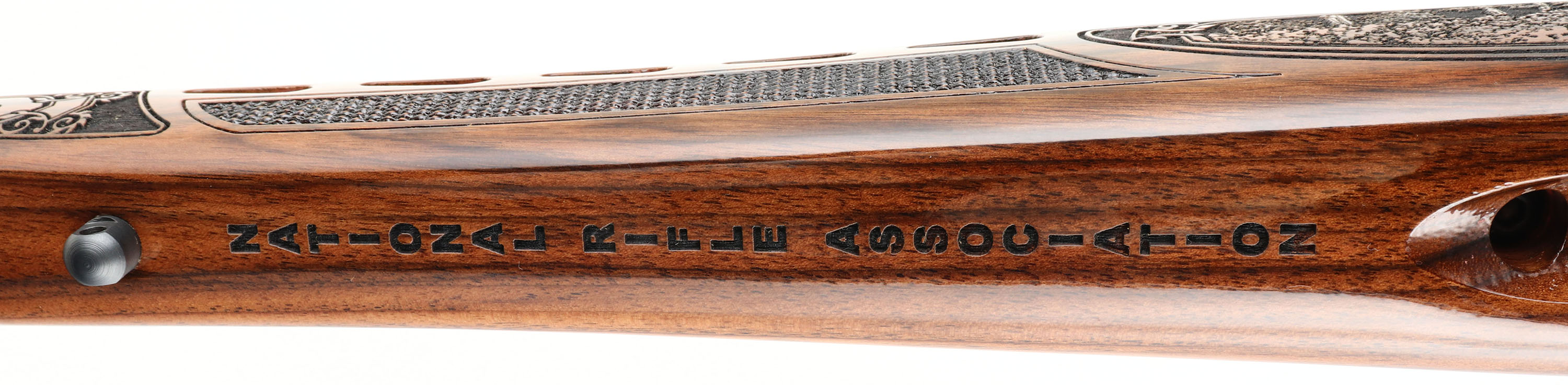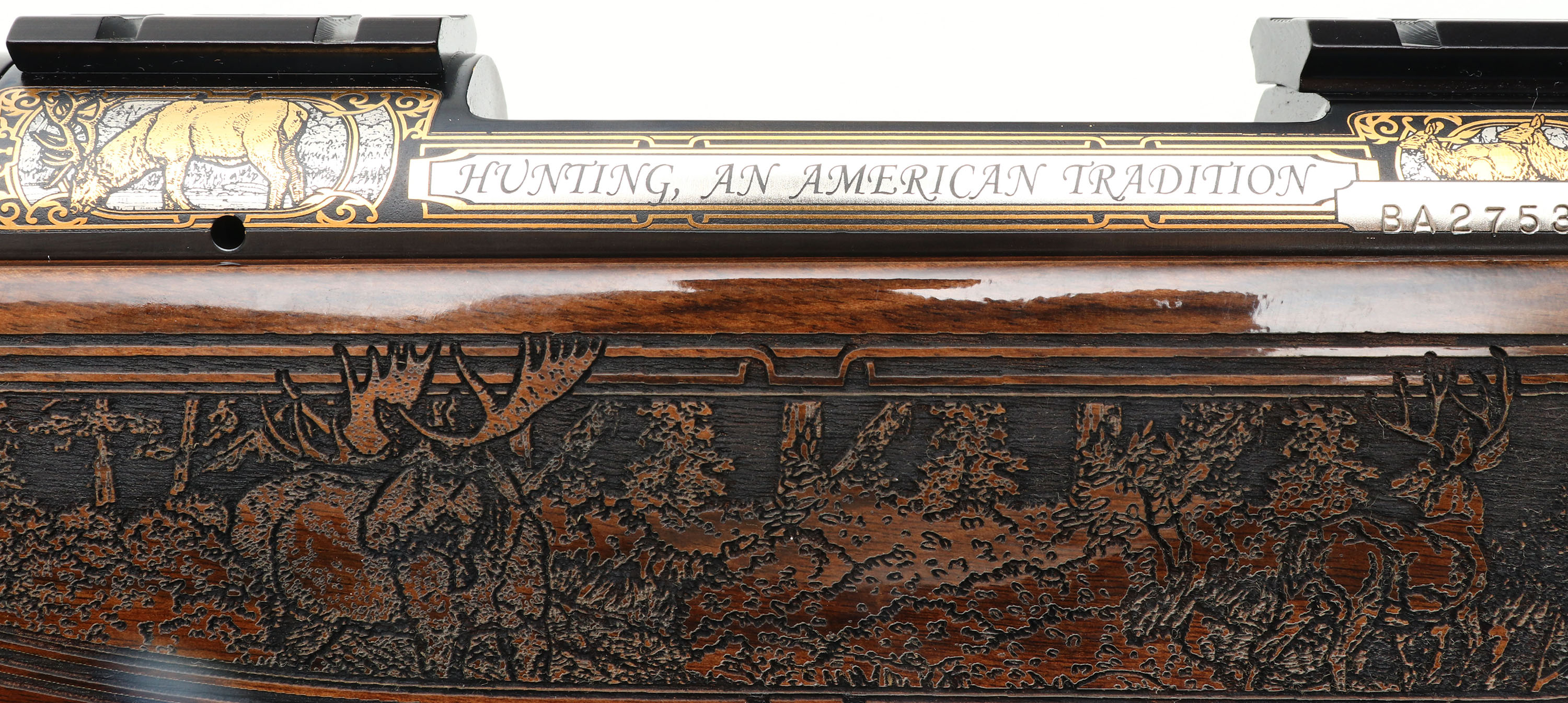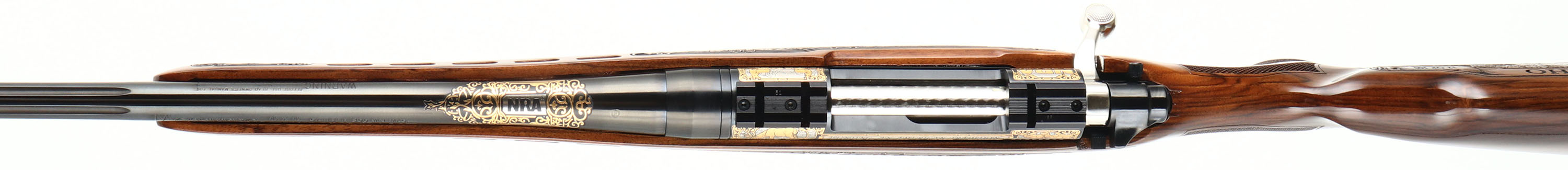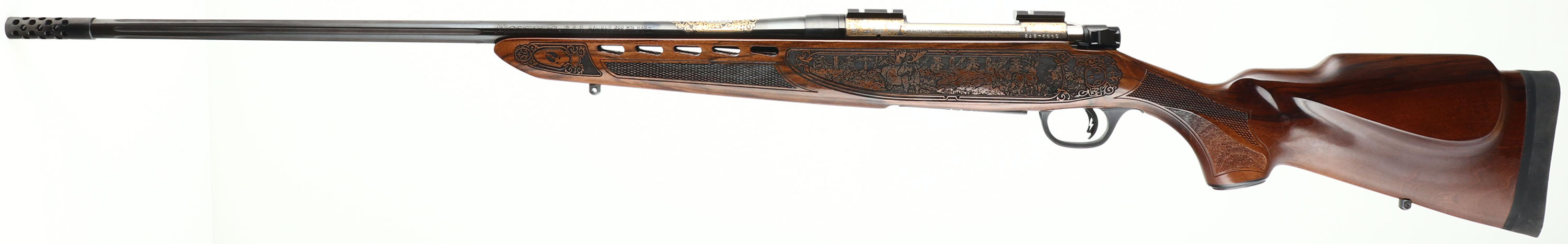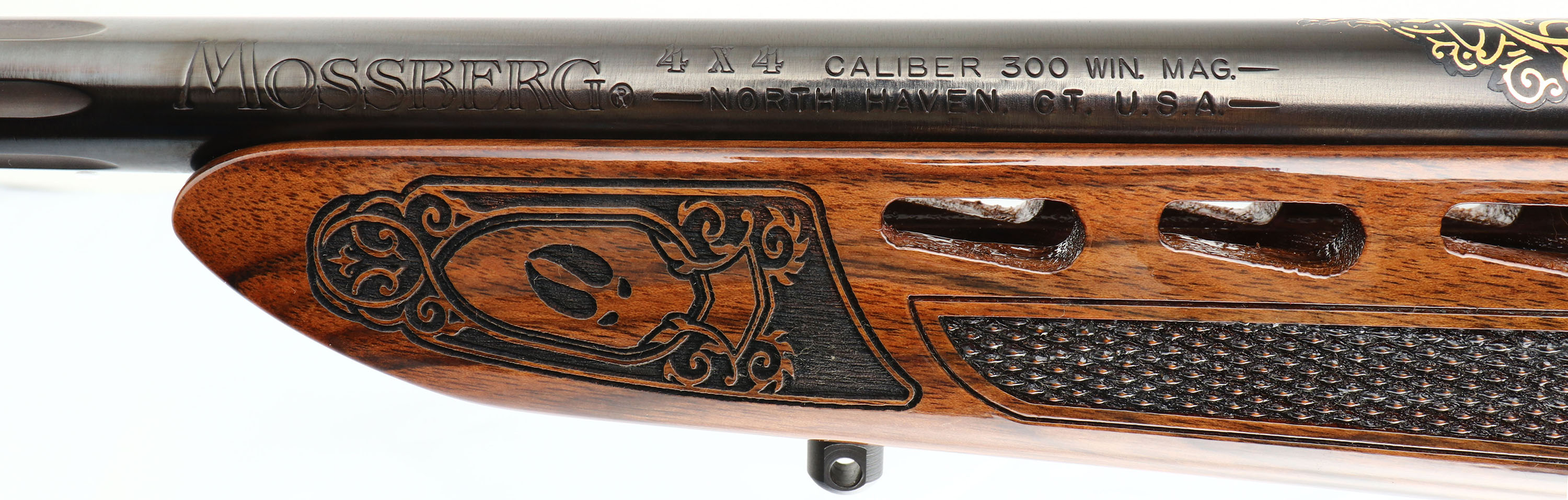 Mossberg, Model 4X4 Hunting Tradition NRA Idaho Commemorative Special Edition, CAL: 300 WIN MAG, MFG: 2012, SN: BA275333, Bolt Action Rifle, 24'' free floating & fluted barrel, 26'' with the muzzle brake. This firearm was a special fund raising edition for the NRA by American Legacy Firearms. There were just 100 rifles produced for each state, this being # 12 of 100 for Idaho. The American-walnut stocks are ornately engraved with wilderness scenes depicting a father & son sharing a hunt of two buck dear. The forearm displays engraved popular North American big-game animals of a bear, ram, deer & moose. The bottom of the fore-end is engraved with ''National Rifle Association''. The engraving on the stock was done by SWS Engraving in Hope, Ark., a plant owned & operated by Hanson. The stock is finished with an extra-durable coating to protect the engraving during normal use. All metal parts, including the barrel & receiver, are buffed, blued, engraved & then plated in gold, nickel or blue, as the design dictates. The left side having cow & bull elk, the right Prong horn & the ''NRA'' in silver & gold. The bolt is nickel-plated and then hand-jeweled. The metal work done by American Legacy Fireworks, Inc. The original checkered. engraved & capped pistol grip walnut stock remains mint. The original metal blue finish remains new. Bore is mint. The receiver holds a couple of scope blocks for future scope mounting, with no open sight provisions. Mossberg solid recoil pad & sling studs. Detachable mag. Steve Faler & American Legacy Firearms have a mantra, ''Life's too short to shoot an ugly gun!'' With these words in mind, they produced this fine NRA Special edition. The rifle comes in the original box, with packaging, booklet & paperwork packet, & Lock. Basically new old stock. These sold for $1795 back in 2012. FFL Req. - Value: 1500 to 2500