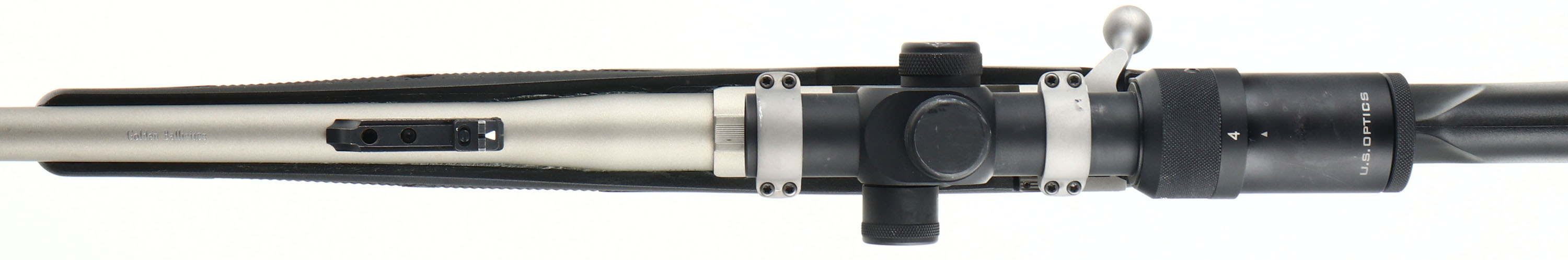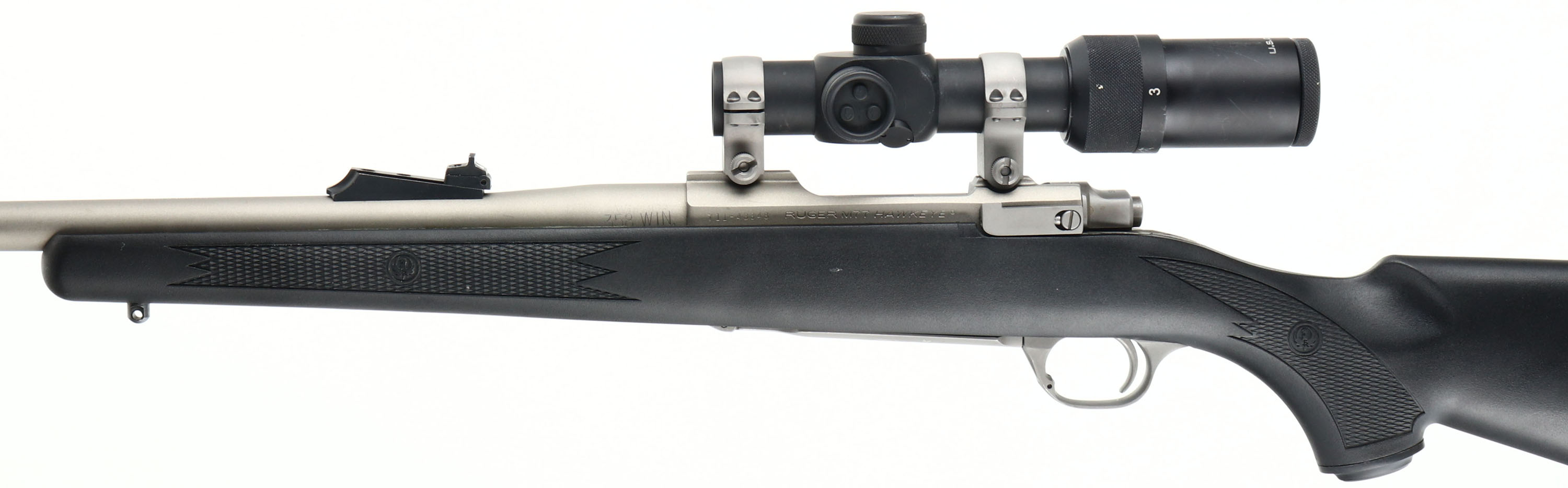 Ruger M77 Hawkeye, Custom Rifle, CAL: .358 WIN, MFG: Modern, SN: 711-43348, Bolt Action Rifle, 20 3/4'' Golden Ballistics barrel. The factory checkered & capped pistol grip synthetic stock is excellent. The satin silver finish is excellent, with minor storage marks. Bore is excellent. The barrel holds an adjustable rear sight & ramp elevated blade front sight. The receiver carries a U.S Optics 1x4 scope, with illuminated red dot. Stock carries a solid factory Ruger recoil pad. Sling studs. A quality custom production rifle in a big game caliber. FFL Req. - Value: 500 to 800