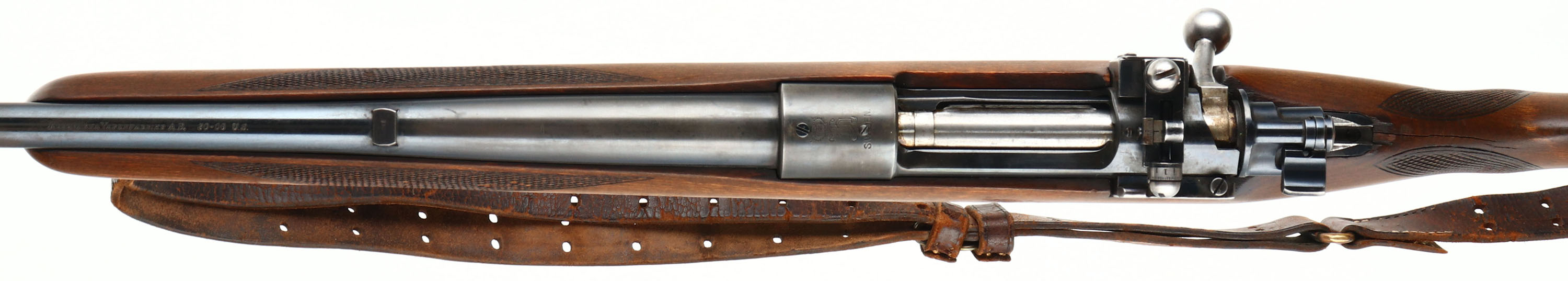 Husqvarna, Repeating Rifle 640, CAL: 30-06, MFG: 1951, SN: 116576, Bolt Action Rifle, 23 5/8'' barrel. The checkered & capped flat pistol grip wood stock is very good & solid. There is a 2'' crack off the back of the receiver & a small 1'' grain crack coming off the back of the trigger guard, otherwise in great condition. The metal blue finishes are a combination of original blue & added blue finishes rating 85% overall. Bore is excellent. The receiver has a side mounted Redfield adjustable rear sight & its also tapped & drilled, with (4) screw filled holes. The barrel has a blank filled rear dovetail & a ramp elevated blade front sight. Stock carries a Pachmayr ventilated recoil pad. Comes with leather sling. A utilitarian hunting rifle built on one of the most durable actions ever made. FFL or C&R Req - Value: 300 to 500