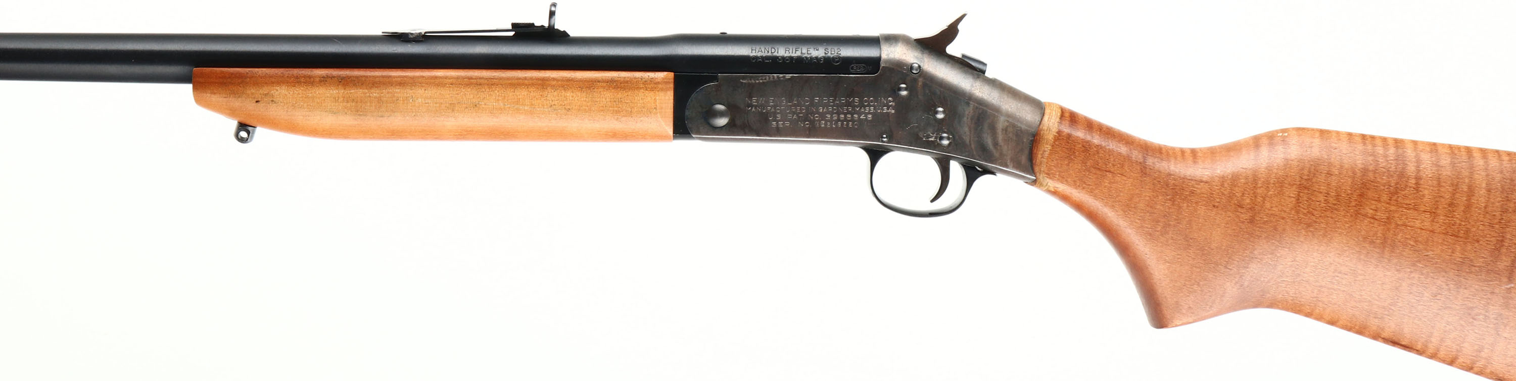 New England Firearms, Handi-Rifle SB2, CAL: .357 MAG, MFG: Modern, SN: NE218220, Break Action Single Shot Rifle, 22'' barrel. The flat pistol grip wood stock & forend are excellent, with light handling wear & minor scuffs at the wrist to the original finish. The metal blue finish on the barrel rates 98%. The receiver is case-hardened, retaining faint case-colors. Bore is excellent. The barrel is tapped & drilled for scope mounting, with two of the three screw holes open. The barrel holds factory iron sights. Sling studs. Stock carries a grooved plastic buttplate. FFL Req. - Value: 200 to 400