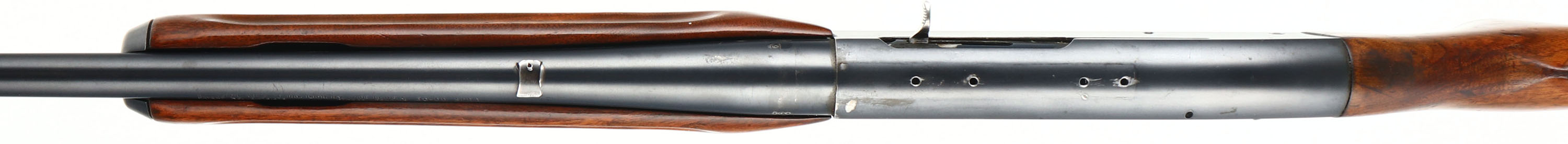 Remington Woodsmaster Model 740, CAL 30-06, MFG: 1956, SN: 49196, Semi-Auto Rifle, 22'' barrel. Second year rifle. The original flat pistol grip wood stocks are good & solid, despite 2'' stress cracks on each side of wrist emanating from the receiver. There is thinning & flaking of the original finish & some minor scrapes & contusions. The original metal blue finish rates 85% overall. Bore is very good & bright. The receiver carries four open holes on top from previous scope block mounting, an additional hole on the back left edge & two screw filled holes on the left side of receiver for side mount receiver sight mounting. The barrel holds a blank filled rear dovetail & blade front sight. Buttstock carries a Remington marked metal buttplate. Comes with a second removable mag. Single rear sling stud. FFL or C&R Req. - Value: 300 to 500