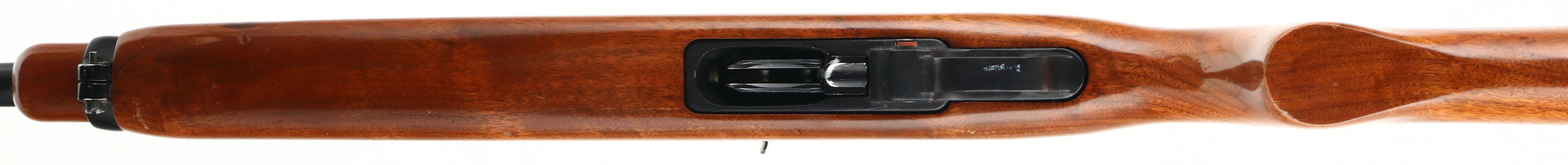Ruger, Ruger Carbine .44 Magnum, CAL: .44 MAG, MFG: 1975-85, SN: 102-83848, Semi Auto Rifle, 18 3/4'' barrel. The original flat pistol grip stock is excellent, which minor contusions, scrapes & dings to the original finish. The is a tight 5'' grain crack in front of the mag loading port on the bottom of the forend. The metal blue finish on the barrel & receiver rates 97% overall. Bore is excellent. The chamber end of the barrel is tapped & drilled, with (2) filled screw holes & the front screw head is broken off. The receiver is tapped & drilled, with the two rear holes holding an adjustable Williams peep sight. The barrel holds a folding leaf rear sight & blade front sight. Factory rear sling stud & additional barrel band sling stud. Stock carries factory metal buttplate. Concealed within the stock is a tubular magazine that holds four rounds that are loaded shotgun style. FFL Req. - Value: 500 to 1000