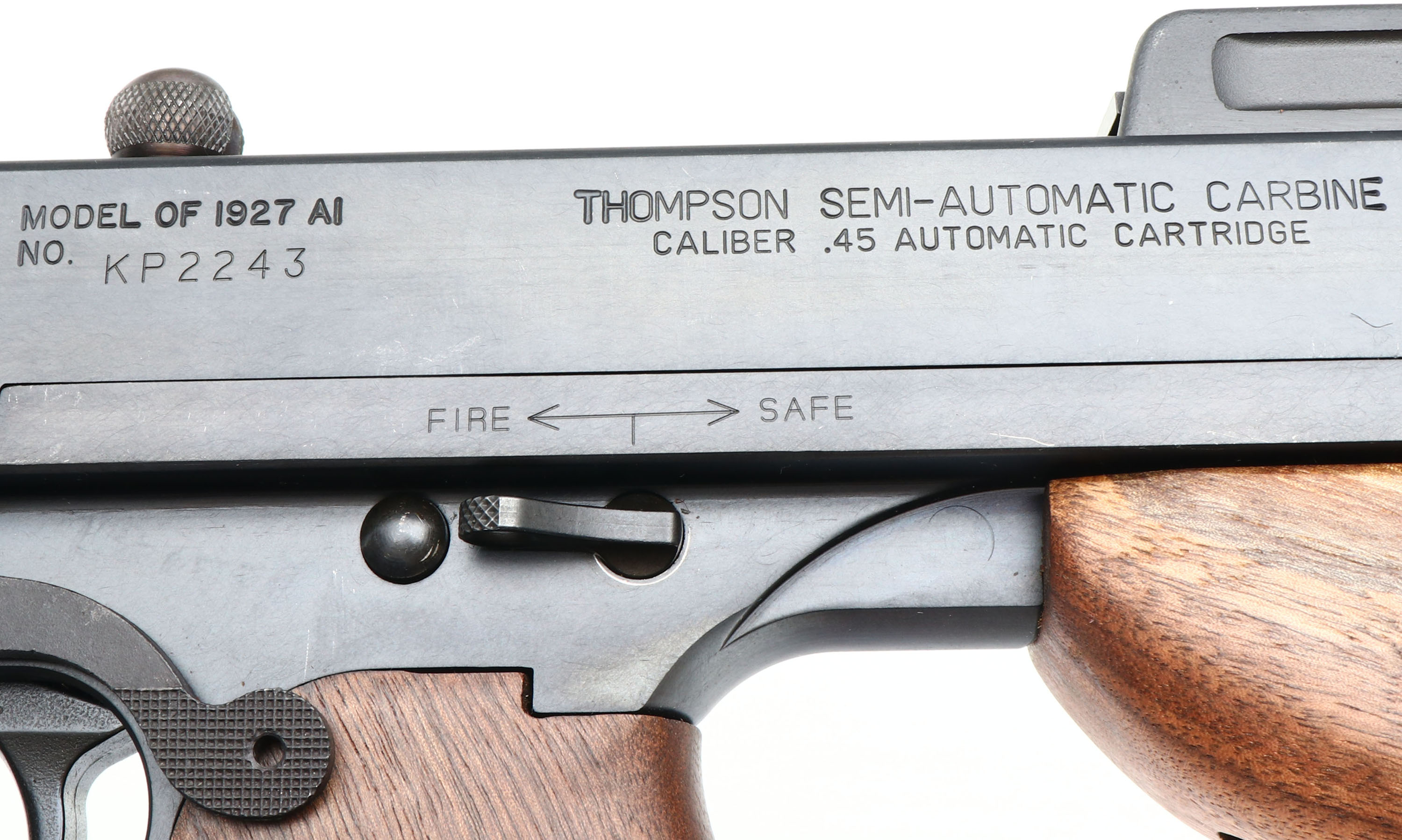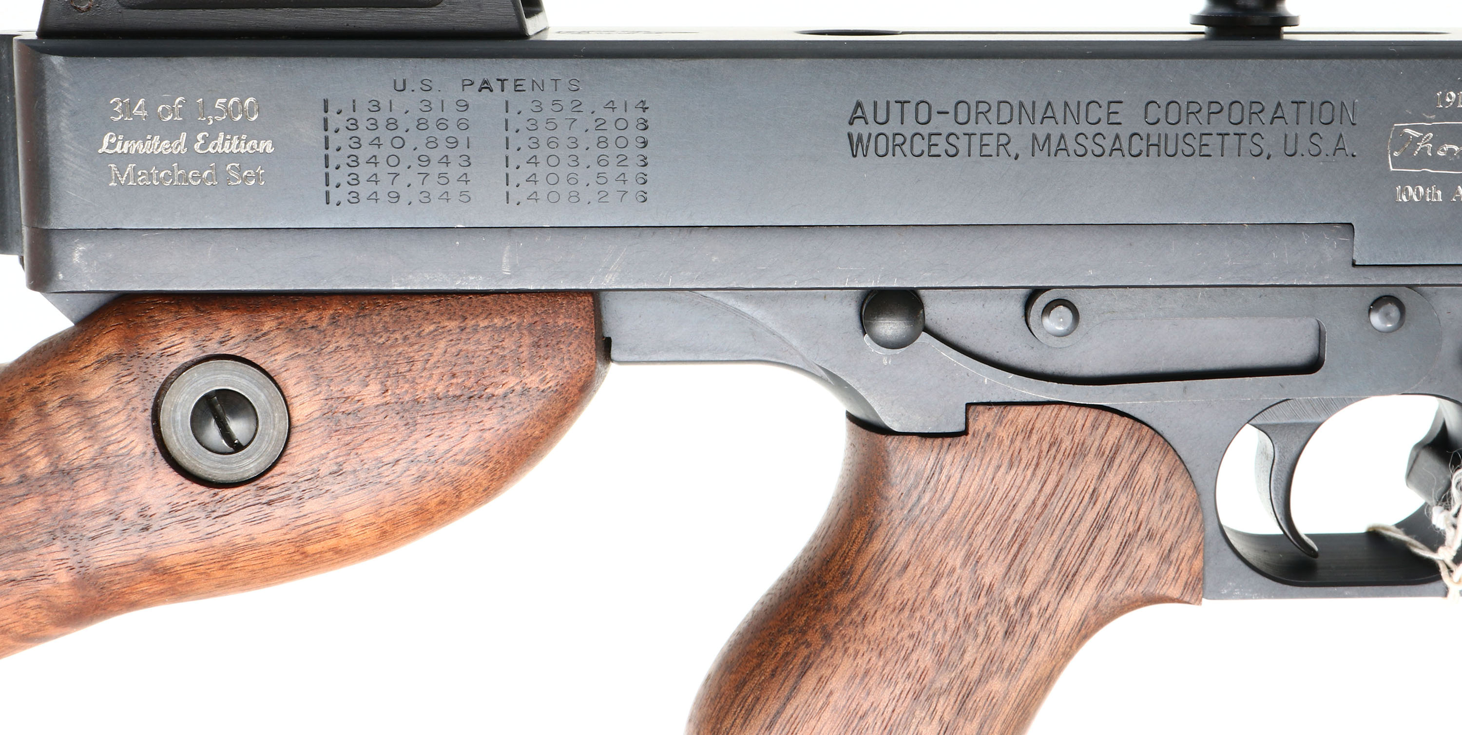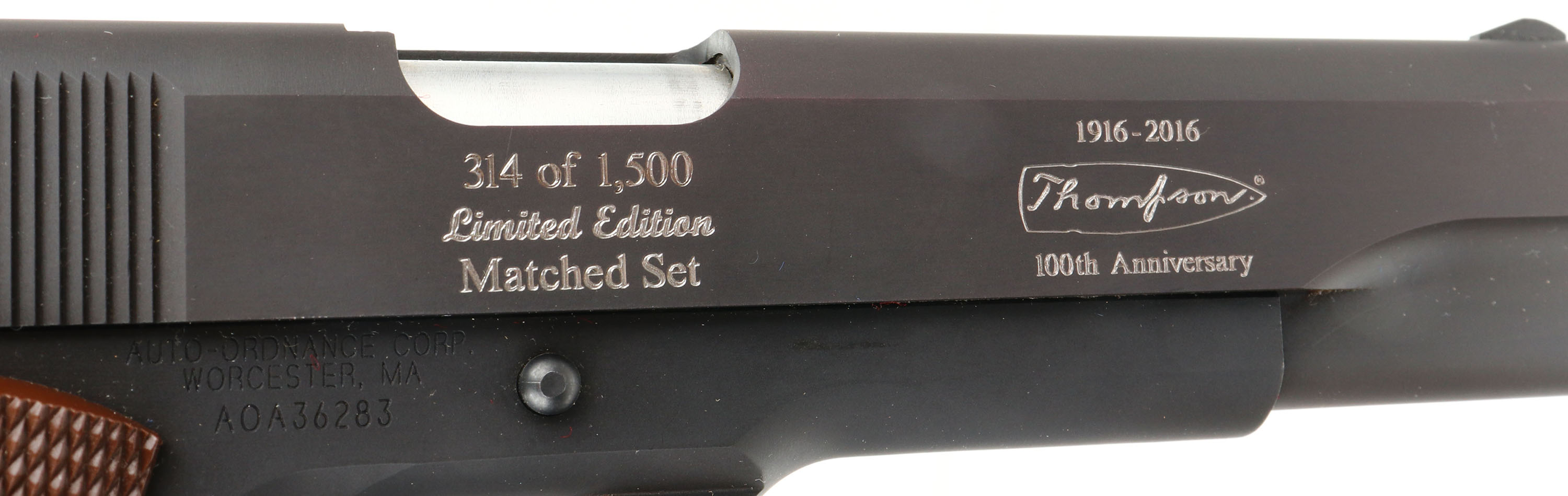 CASED & NEW Thompson Auto Ordnance Corporation, (Kahr Arms), 100 Year Anniversary Two Gun Set, Models Thompson 1927A-1 Rifle & Thompson 1911A1 GI Specs pistol., CAL: 45 ACP, MFG: 2016, SN's: A0A36283, KP2243, Semi Auto Rifle & Pistol, 16.5'' (18'' with compensator) & 5'' barrels. This is number 314 of 1500 sets produced to celebrate the 100 Year Anniversary 1916-2016 of the Thompson Auto Ordnance Corporation. Auto-Ordnance was a U.S. arms development firm founded by retired Colonel John T. Thompson of the United States Army Ordnance Department in 1916. Auto-Ordnance is best known for the Thompson submachine gun, used as a military weapon by the Allied forces in World War II, & also notorious as a gangster weapon used during the Roaring Twenties. Featured in the set is a deluxe replica of a Thompson 1927A-1 Carbine (Tommy Gun) & a Thompson 1911A1 GI Specs pistol. The deluxe American walnut vertical foregrip, pistol grip & fixed stock on the Tommy gun are mint, displaying beautiful wood grain & factory finish. The factory metal blue finishes are 99%+. The receiver is prominently engraved with the classic Thompson logo, limited edition numbers, & displays the words ''100th Anniversary'' on the matte black steel frame. The gun weighs 13 lbs. & has an overall length of 41''. Features include a pinned in front blade & an open rear adjustable sight. Bore is mint. Has the stick mag.