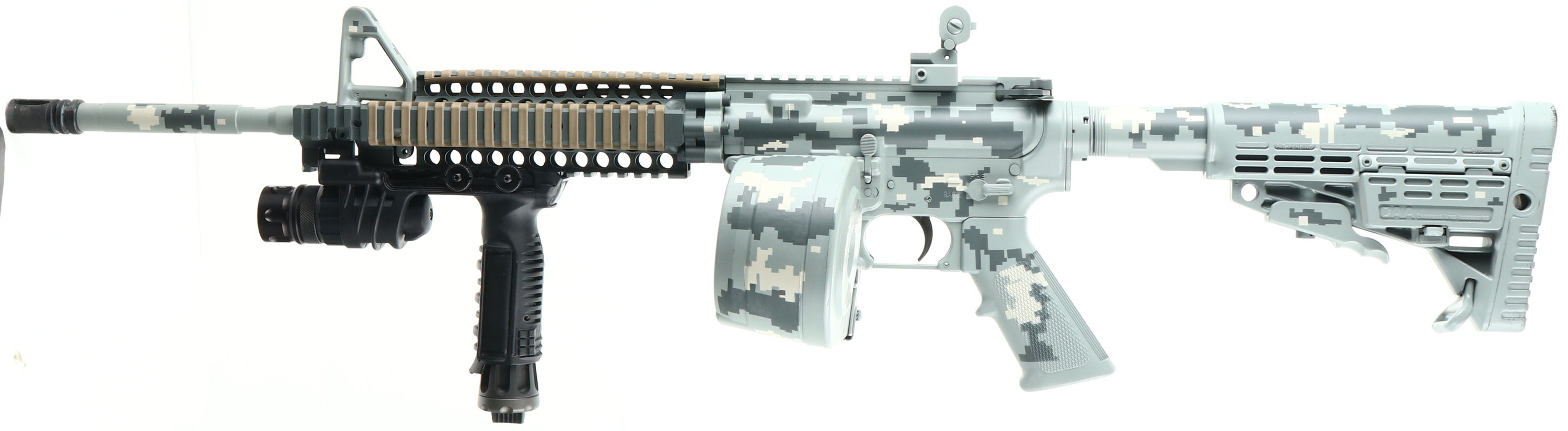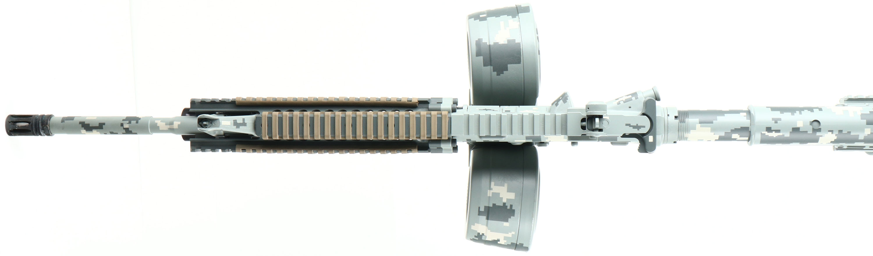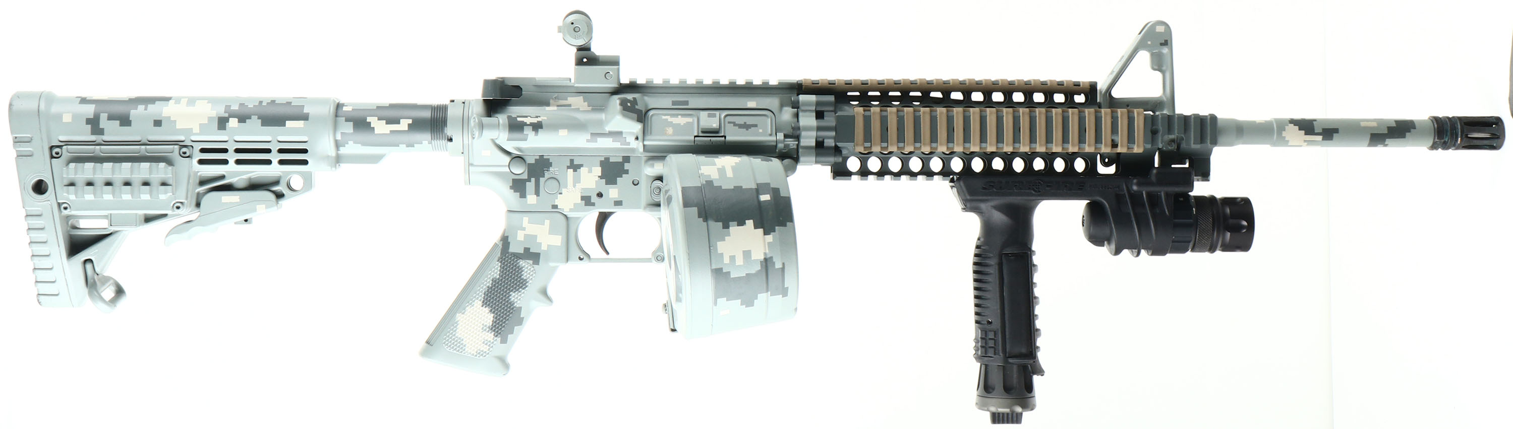 Rock River, LAR-15, CAL: 5.56, MFG: Modern, SN: CM159423, Semi Auto Rifle, 16 1/2'' barrel. The synthetic 6-pt adjustable stock & checkered grip are excellent. The digital camo finish rates 98% overall, with minor handling marks. Bore is excellent. Factory iron sights. The forend is a quad picatinny rail, with rubber inserts on (3) faces & the bottom rail holds a SureFire KM4 tactical flashlight, with white or infrared tactical light. It has a self-locking bezel selector ring to switch between the types of light. C-Mag Twin Drum 100 rnd mag. FFL Req. - Value: 600 to 1100