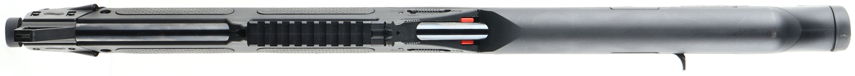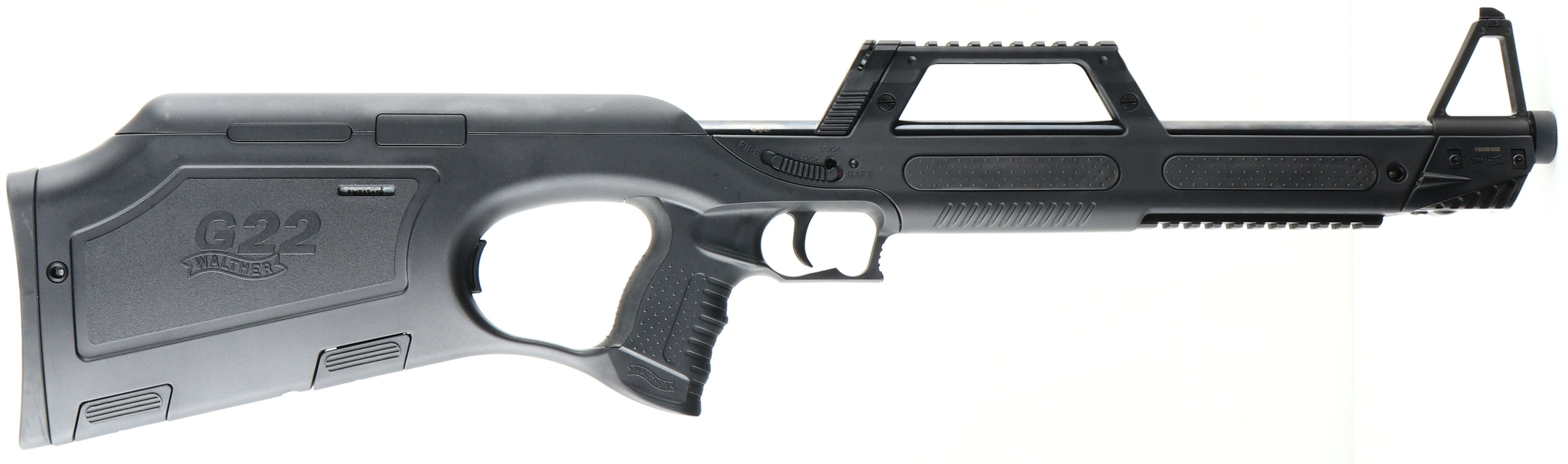 Walther, G22, CAL: 22 LR, MFG: Modern, SN: PW013419, Semi Auto Rifle, 20'' barrel. The one-piece synthetic stock, with textured rubber grip & forend panels are excellent. The metal blue finish on the barrel rates 97%. Bore is excellent & minty. Factory sights. The front of the stock has a factory laser. Upper & lower picatinny rails for accessories & optics. A spare magazine is stored inside the polymer stock behind the magazine well. This rifle can be configured for both left & right hand shooters. The stock is designed so that the ejection port & cocking handle can be relocated to either side. An interesting design for a bullpup .22 rifle. FFL Req. - Value: 300 to 600