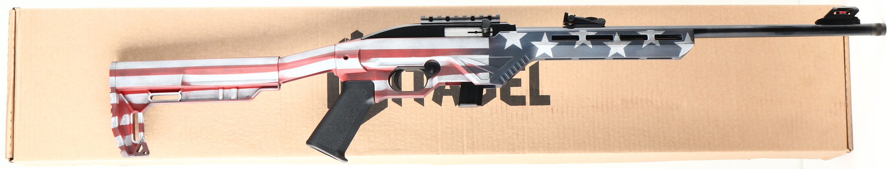 BOXED & NEW Citadel, Trakr, CAL: 22 LR, MFG: Modern, SN: EWB4823758, Semi Action Rifle, 18'' Threaded barrel. The molded, one-piece non-adjusting American Flag motif synthetic stock is mint. The factory black finish on the barrel & receiver rates 99%+. Bore is minty. The top of the receiver features a Picatinny rail making it easy to mount a scope or optics. The rifle also carries an adjustable green fiber optic rear, & red fiber optic hooded front sights. Detachable 10 round mag. A great little inexpensive shooter, with a cool American look. FFL Req. - Value: 200 to 300
