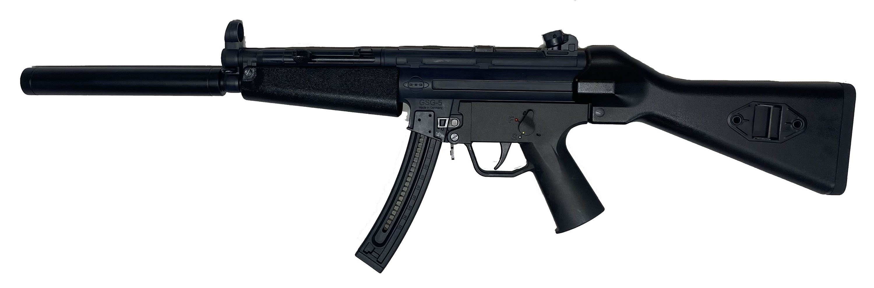 GSG, Model GSG-5, CAL: 22 LR, MFG: Modern, SN: A317085, Semi Auto Rifle, 16 3/8'' barrel. The synthetic stock, grip & forend are excellent. The matte gray finish on the receiver rates 98% overall. Bore is excellent. Factory sights. The imitated suppressor is for cosmetic appearance only, it is incapable of functioning as a suppressor. The longer barrel is covered with a barrel shroud (mock suppressor) for aesthetic purposes only. This rifle externally resembles the Heckler & Koch MP5 style submachine gun. FFL Req. - Value: 300 to 600