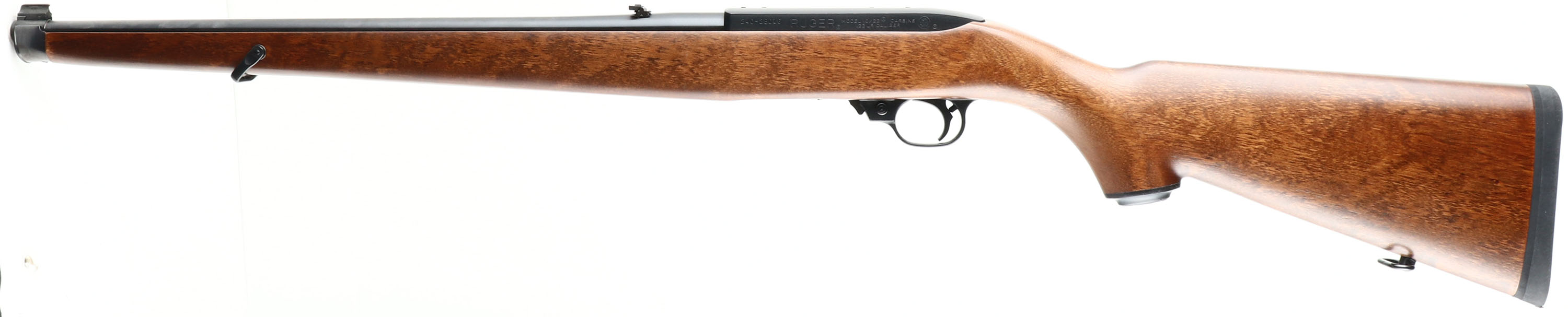 Ruger, Model 10/22 Carbine, CAL: 22 LR, MFG: 1994, SN: 240-28016, Semi Auto Rifle, 18 1/2'' barrel. The capped pistol grip full length wood stock is excellent. The metal blue finish on the barrel rates 99%+. The matte black finish on the receiver & trigger guard rates 99%+. Bore is excellent & minty. The barrel holds a standard folding leaf rear sight & blade front sight. Stock has sling loops & a Ruger solid black rubber recoil pad. FFL Req. - Value: 300 to 500