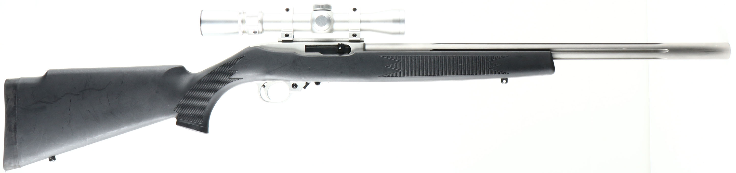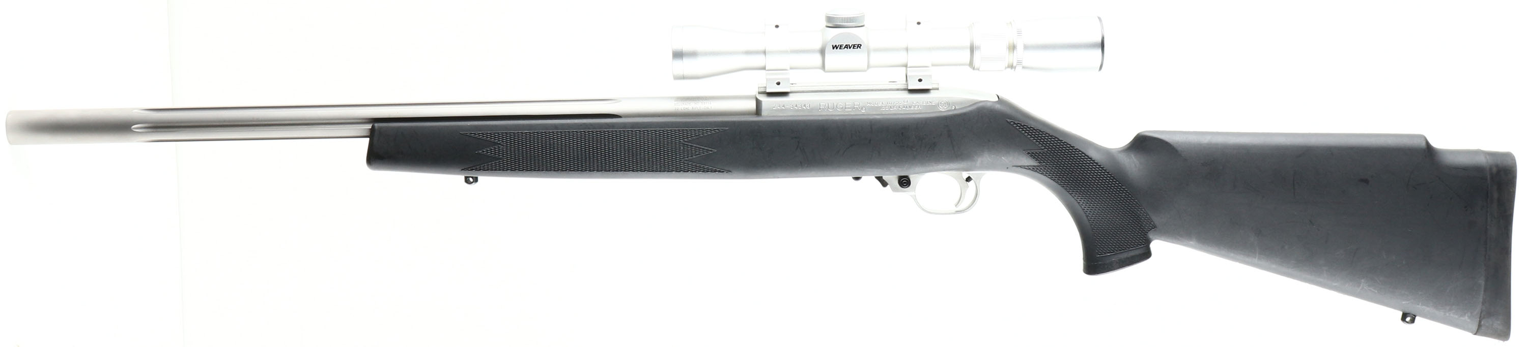 Ruger, Model 10/22 Custom, CAL: 22 LR, MFG: 1996, SN: 244-34343, Semi Auto Rifle, 20'' barrel. The Butler Creek Monte Carlo checkered synthetic stock is excellent, with handling marks & scuffs. The stainless steel finish on the upgraded Butler Creek fluted heavy barrel & receiver is excellent. Bore is excellent & minty. The receiver holds a Weaver VR7 2.5-7x28 scope. No open sight provisions. Stock has Butler Creek solid black rubber recoil pad. FFL Req. - Value: 300 to 500