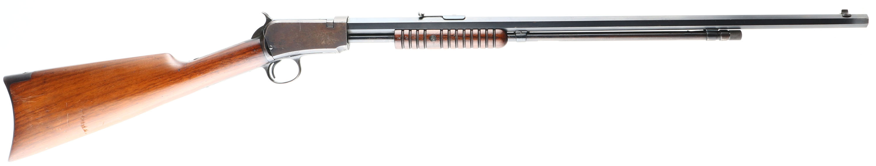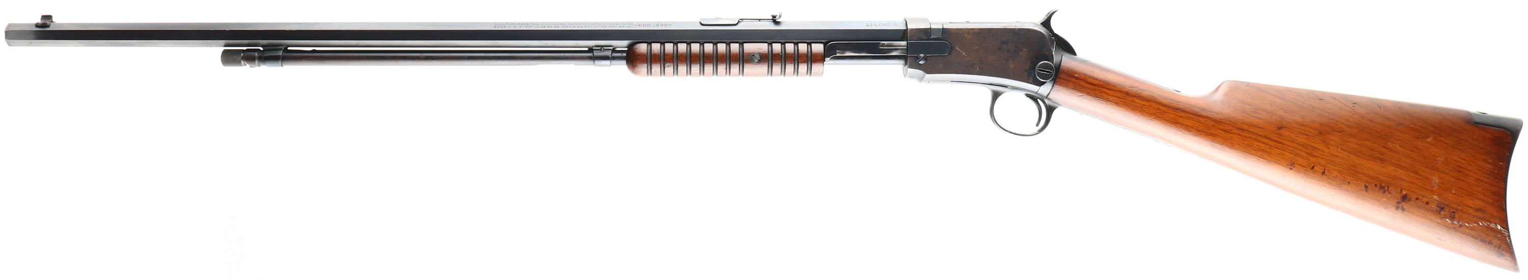RARE Winchester, Model 90, Third Variation, CAL: 22 LONG R., MFG: 1919, SN:633995, Pump Action Rifle, 24'' Octagon barrel. Only 10% of this model were produced in single caliber LONG RIFLE, which adds a 50% increase in value amongst collectors. The original straight grip wood stocks are excellent & solid, but there are several small contusions & dings on the stock. There are also other minor scratches & scuffs to the original finish. The original metal blue finish rates 90% on barrel, 20% on mag, while the blue on the receiver has flaked or worn mostly away & has developed a thin brown patina. Bore is good, but with spotty areas of roughness amongst strong rifling. The barrel holds the original adjustable rear & small blade front sights. Buttstock carries a smooth crescent metal buttplate. Tight smooth action. A very nice, original, & fairly rare Long R marked model 90. FFL or C&R Req. - Value: 1500 to 3000