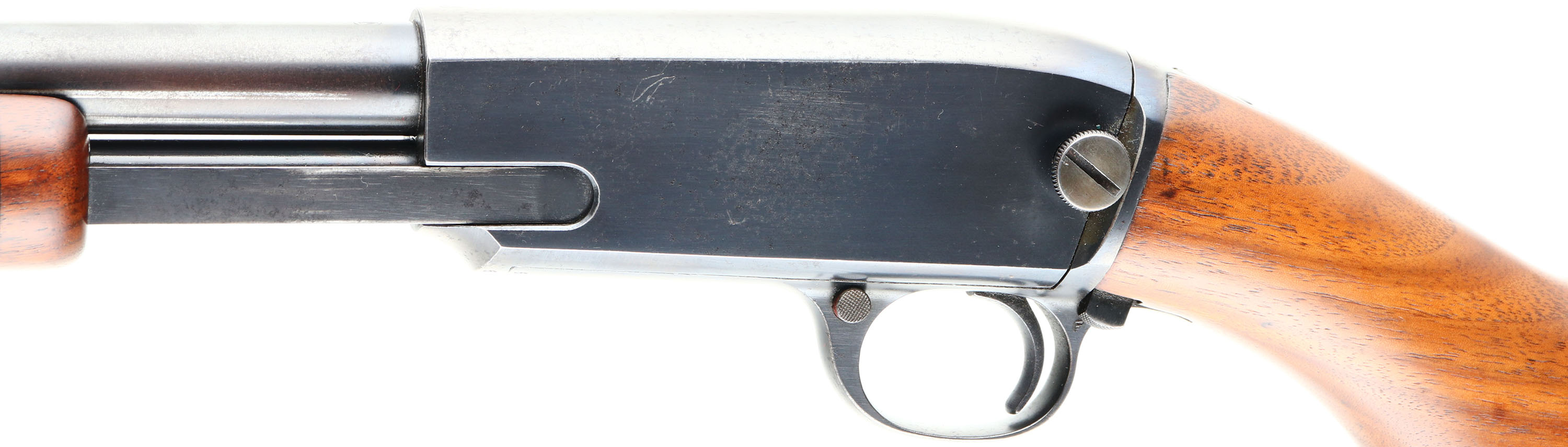 Winchester, Model 61, CAL: .22 L. RIFLE, MFG: 1938, SN: 37589, Pump Action Rifle, 24'' round barrel. Rare single caliber marked 61 with the early pre-war small forend & pre-war rust blue finish. The original flat pistol grip wood stock & grooved forend are excellent, having been cleaned, possibly lightly sanded & very nicely refinished. There are very few minor contusions, scrapes & scratches. The original metal finish rates 70% on barrel toning a bit gray & toned to a thin brown patina in areas of loss. The finish on receiver & mag rates 80%, with some speckled haze developing on the receiver. Bore is excellent. The barrel holds an adjustable rear sight & small blade front sight. Buttstock carries the earlier checkered metal buttplate. FFL or C&R Req. - Value: 1000 to 2000