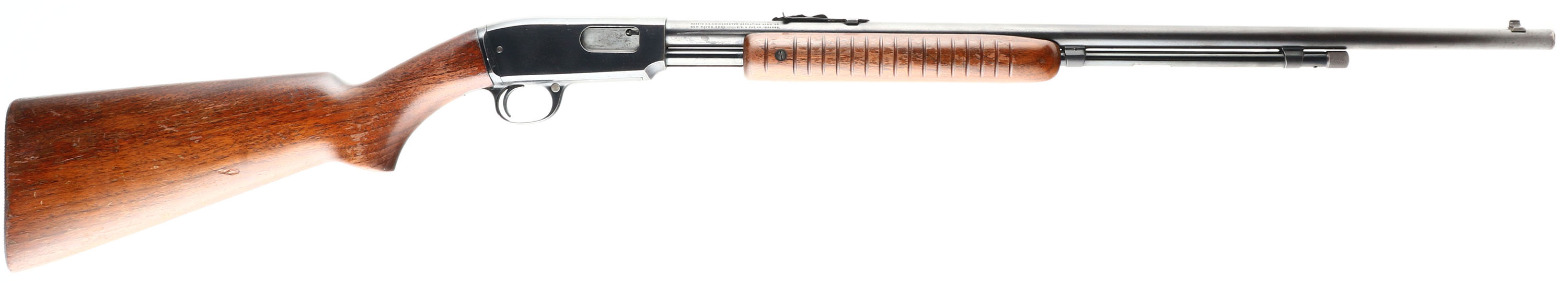 Winchester, Model 61, CAL: .22 S. L. or L.R., MFG: 1941, SN: 56245, Pump Action Rifle, 24'' Round barrel. The original flat pistol grip wood stock & grooved forend are Very good, with several minor scratches, a small gouge on the right side of the stock & thinning or flaking to the original finish. The original metal blue finish rates 85% overall. Bore is excellent. The barrel holds the original adjustable rear & small blade front sights. Buttstock carries the earlier checkered metal buttplate. Smooth action. A very nice & original example. FFL or C&R Req. - Value: 400 to 800