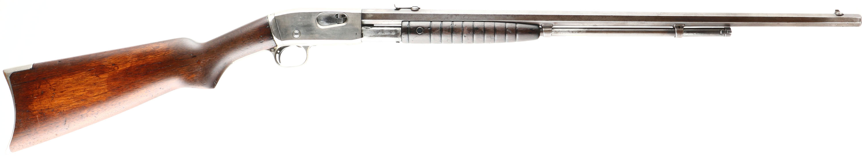 RARE NICKELED Remington, Model 12 B GALLERY SPECIAL, .22 SHORT ONLY Cal., MFG. 1910, SN: 33670, Pump Rifle, 24'' Tapered Octagon barrel, 2/3 rds mag. The Remington Model 12 is a slide-action rifle designed by John Pedersen & produced by the Remington Arms Company from 1909 to 36. The Model 12 is chambered in .22 Caliber Rimfire & accepts Short, Long, & Long Rifle cartridges, with a tubular magazine capacity of 14, 11, & 10 rounds respectively. The Model 12B ''Gallery Special'' was designed for use in shooting galleries, & can only fire .22 Short cartridges. These shooting galleries were extremely popular in the first half of the 20th century & Remington Model 12 rifles where amongst the favorites used due to their quality & reliability. This 2nd year of production ''GALLERY SPECIAL'' rifle is fairly rare. While over 800,000 Model 12 rifles were produced in it's four variations, A, B, C & CS, the model 12B saw the lowest production & is subsequently encountered far less often today. Even rarer are the half nickeled examples like this rifle. Due to their use in shooting galleries, most saw heavy use. The original factory, flat knob wood stock & honeycomb forend are very good & solid. Finish has darkened & thinned with age & use, with several minor contusions & light scratches. The original metal blue finish on the barrel & mag have worn to a thin brown patina. The NICKEL finish on receiver & crescent buttplate is excellent, retained at 98%, with a spot of thinning on the top of the receiver. All stampings & markings are crisp. Original front & rear sights. Bore is good & clean, with some cleaned roughness amongst solid rifling. A fairly rare & highly sought after popular amongst collectors grade, rare rifle. FFL or C&R Req. - Value: 1500 to 2500