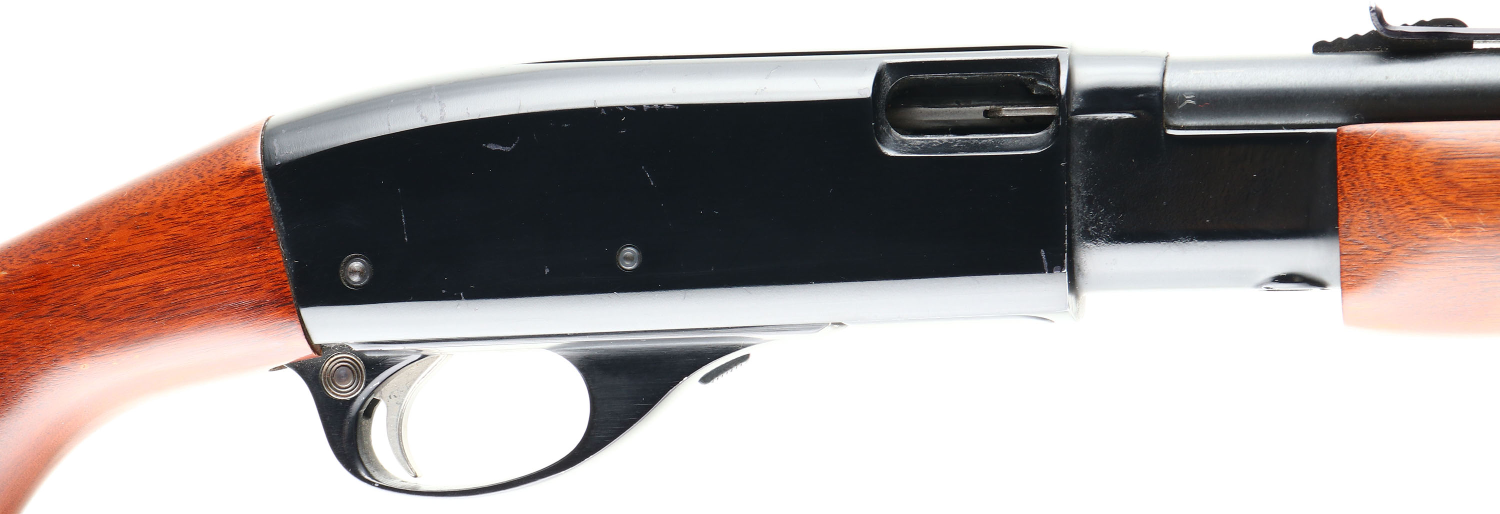 Remington, Model 572 Fieldmaster, .22 S. L. & LR. Cal., MFG. 1960, SN: None, Pump Rifle, 23 1/2'' Tapered round barrel, 3/4 mag. The original factory wood stocks are excellent, with some minor finish level handling marks or scuffs. The stock has a blemish repair on the left side of stock against the buttplate. The original metal blue finish on the barrel & mag rates 98%. The Japan black finish on the receiver is excellent, with a few minor scratches or handling mark. Bore is excellent. The barrel carries the original sights. Stock carries a Remington plastic buttplate. Shooter condition. FFL or C&R Req. - Value: 250 to 500