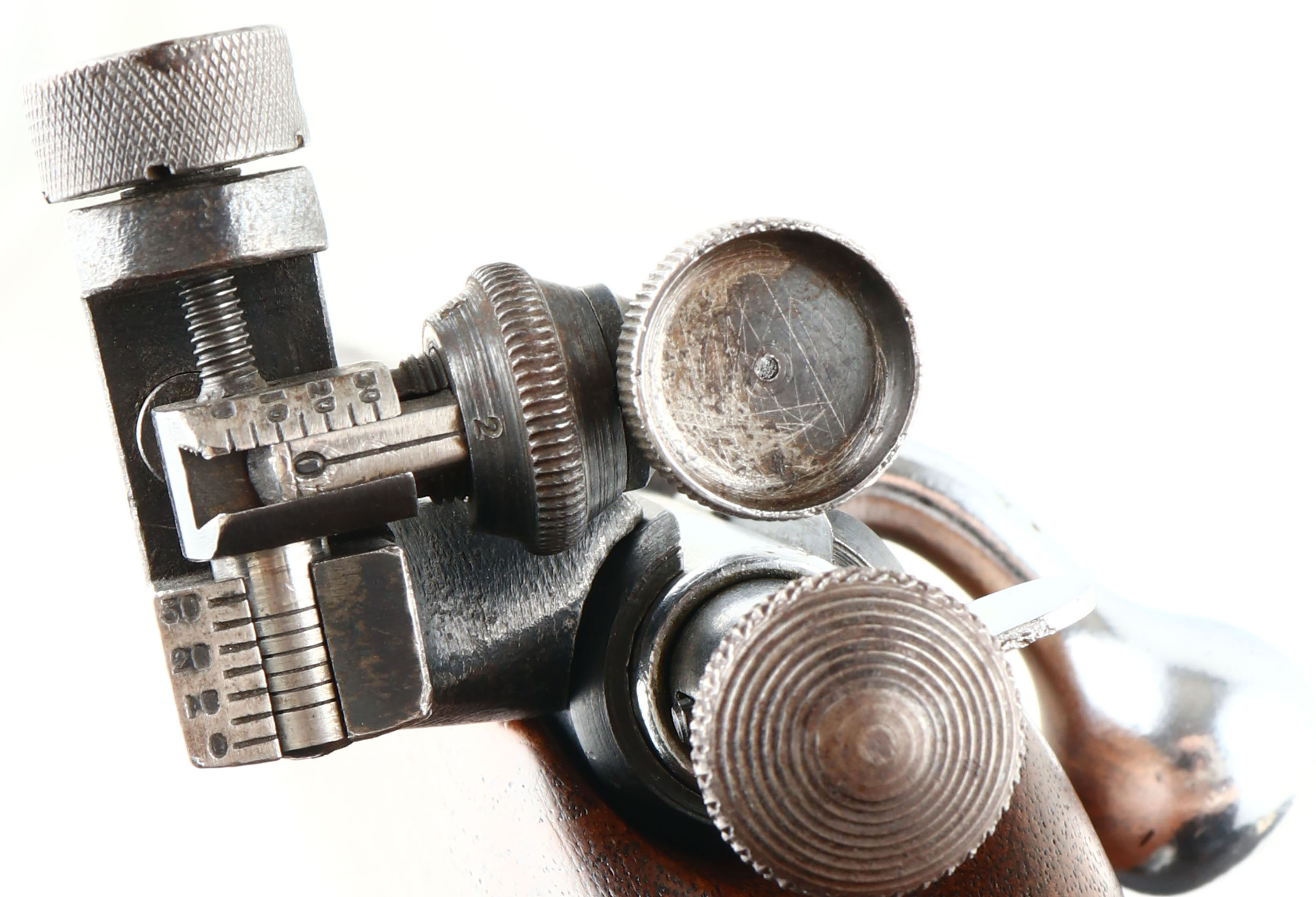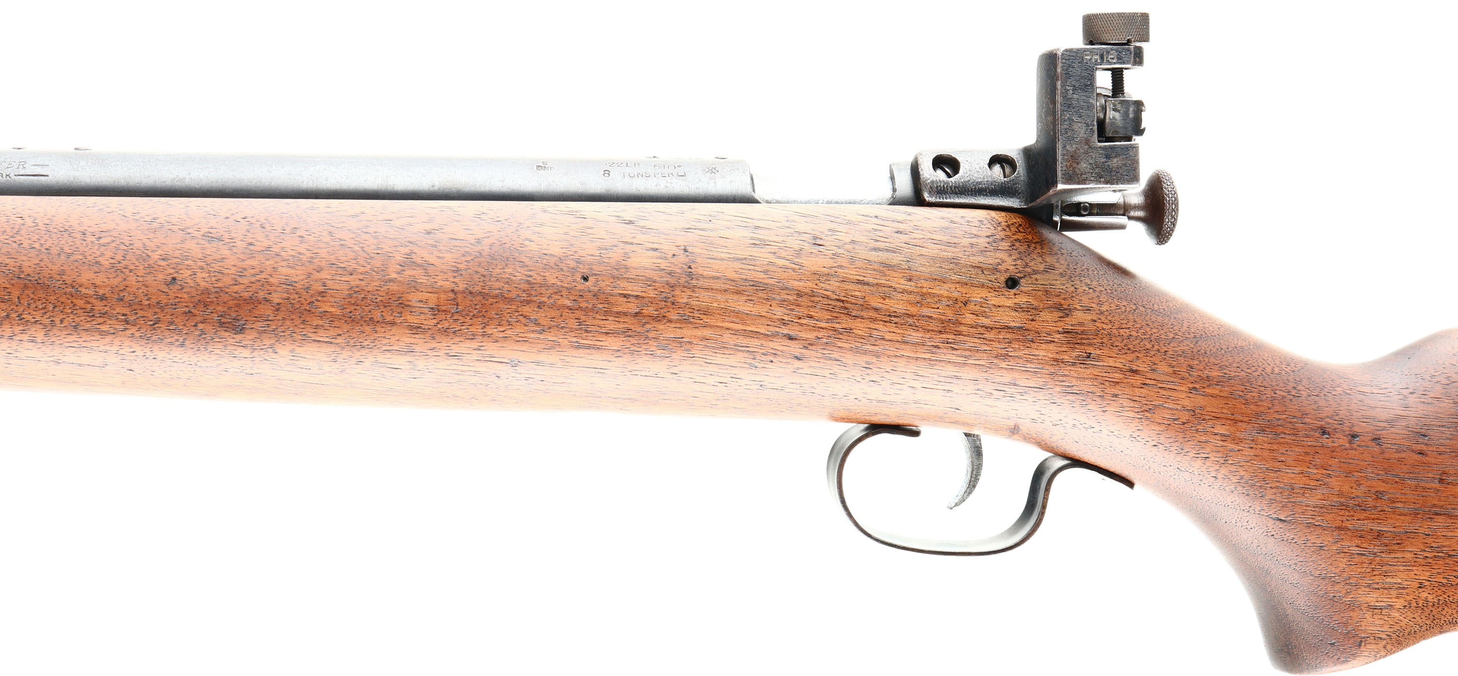 RARE Winchester, Model 67, 2nd Issue (677 Variation), CAL: 22 S.L.LR, MFG: 1937-42, SN: 02345, Bolt Action Rifle, 27 1/8'' barrel. This variation of the Model 67 is referred to as the ''677'', derived from its catalog number G67750R. This rifle is a repatriated WWII Lend-Lease rifle sold to Britain for homeland defense & marksmanship training. According to British proof house records, Winchester sold the British Government scoped Models 67, 677, 69 & 697 rifles. This is one of those rare British Model 677 rifles. The proof marks, model & serial number were not added until 1948. In 1944 British proofing requirements were suspended, hence the rifle was not proofed until 1948 before it was sold to the Parker Hale Co. The professionally refinished flat pistol grip wood stock is excellent, displaying minor contusions & dings to the finish. There is a single 2'' tight hairline crack on the right side of the stock emanating from the buttend. The metal blue finish on the barrel rates 90% overall, with spotting & speckling, & toning to a brown patina in areas of thinning. Bore is excellent. The original Winchester scope was removed & Parker Hale mounted a Model PH16 micrometer rear peep sight & ramp elevated hooded front sight, original scope mounting holes have filler screws. Originally, the rifle was issued with either a 5 or 2 3/4 power scope & there were no dovetails for iron sights. At some point, the Winchester scope was removed & the iron sights were added, thus converting it to a ''Target'' or ''Match'' rifle. Stock carries a checkered steel buttplate. This is a very rare rifle with an unusual history. Highly collectible! FFL or C&R Req. - Value: 500 to 1000
