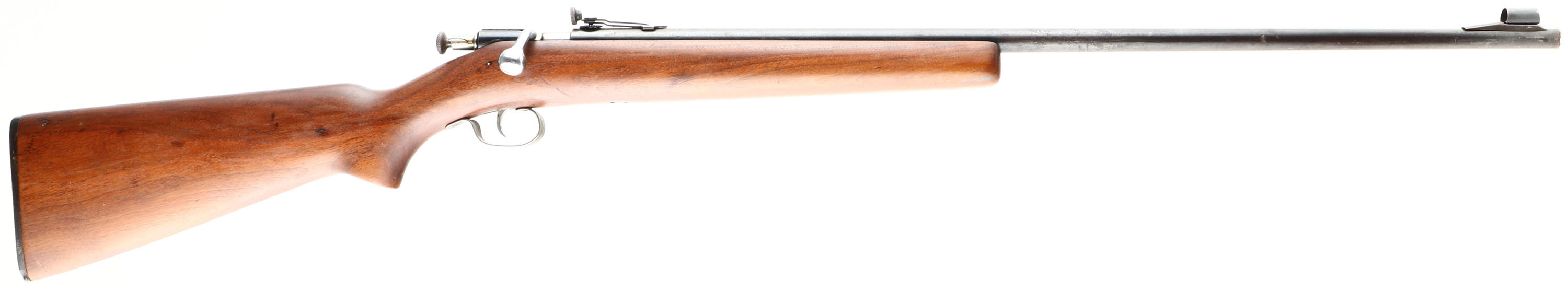 Winchester, Model 68, Marked .22 SHORT, LONG & LONG RIFLE Cal., MFG. 1934-46 SN: None, Take-down, Bolt Action, Single shot rifle, 27'' round barrel, The original flat pistol grip wood stock is excellent, after having been lightly sanded & refinished with some small scuffs, scrapes & contusions. Metal blue finish is a mix of original finish, with added finish & lots of cleaned pitting on the barrel. Bore is very good & bright. The rifle is fitted with the correct Winchester wheel adjusting, aperture receiver sight & ramp hooded blade front sight. Buttstock carries a Winchester checkered plastic buttplate, with a small edge chip.. A good looking example of a model 68. FFL or C&R - Value: 200 to 400