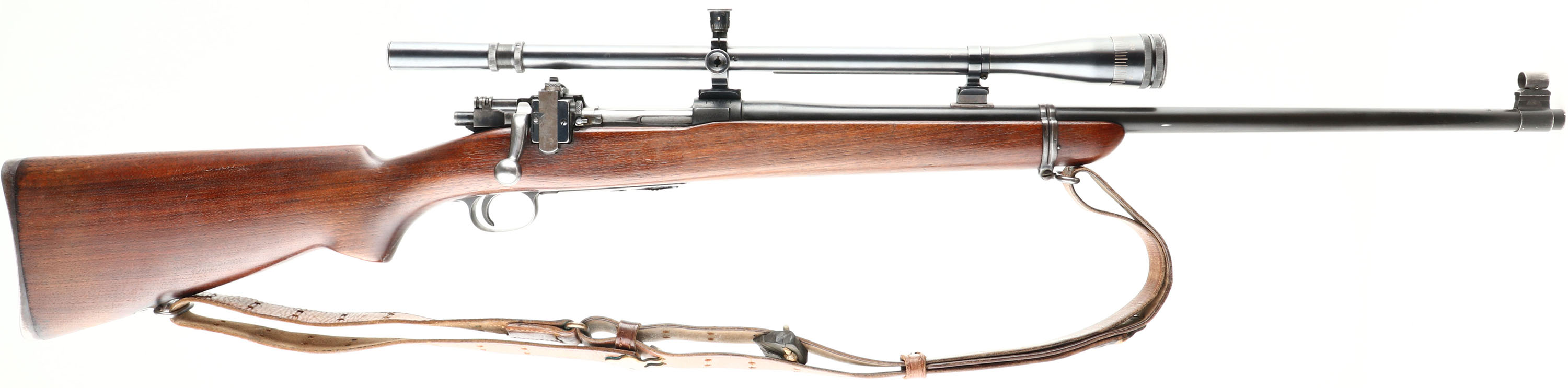 U.S Springfield, M1922M1 Training Rifle, CAL: 22, MFG: 1929 (barrel date), SN: 18754, Bolt Action Rifle, 24 1/2'' barrel. The original flat pistol grip wood stock is excellent. There are minor handling marks to the finish. The military style metal finish rates 97% overall, with light speckling on the receiver. The top of the receiver is marked '' U.S. SPRINGFIELD ARMORY M1922M1 CAL.22 18754 ''. The muzzle end of the barrel is marked in three lines ''S.A. (Flaming Bomb) 8-29''. Bore is excellent. The rifle is fitted with the original Lyman 48 adjustable rear target sight & a elevated hooded post front sight. Additionally, this rifle holds a Lyman Targetspot 10 Power scope on dovetail blocks. Stock holds the original thick checkered metal buttplate. The rifle still carries the original leather sling, connected to the front barrel band & rear sling loop. A very nice example of a 1922M1 Training Rifle. FFL or C&R Req. - Value: 1000 to 1500