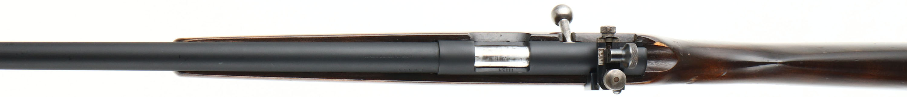 Schultz & Larsen, Model Unknown Bolt Rifle, CAL: 22 LR, MFG: N/A, SN: 11137, Bolt Action Rifle, 23 5/8'' barrel. The company is known for producing competitive target shooting rifles. The round knob wood stock is very good. There are scrapes, scratches, dings & areas of thinning to the high gloss finish. There's a large worn area of finish at the forend belly. The barrel & receiver have been refinished with a matte black finish which is excellent, with handling & usage marks. Bore is excellent. There is a side mounted fully adjustable aperture receiver sight & an elevated hooded silhouette front sight. Stock has open holes from previously mounted sling studs in belly & forend tip. Manufactured without buttplate, smooth buttend. FFL Req. - Value: 150 to 300