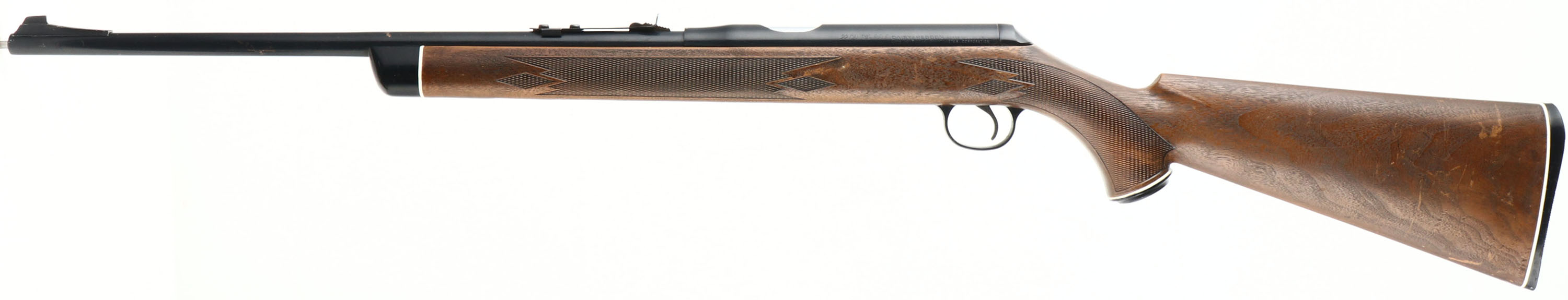 Daisy & Heddon, VL Rifle, CAL: .22 Cal. Caseless VL Ammo, S/N: A036033, 18'' barrel. The original checkered & capped pistol grip wood grain plastic stock, with ebony forend tip is excellent & solid. There are scratches, scrapes & a few thinning areas of the high gloss finish. The metal blue finish rates 97% overall, with a couple areas of flaking revealing metal grey that's toned to a brown patina. Bore is fair, dark & rough. The barrel holds an adjustable rear sight & ramp elevated blade front sight. Stock carries a VL grooved plastic buttplate. FFL Req. - Value: 200 to 400