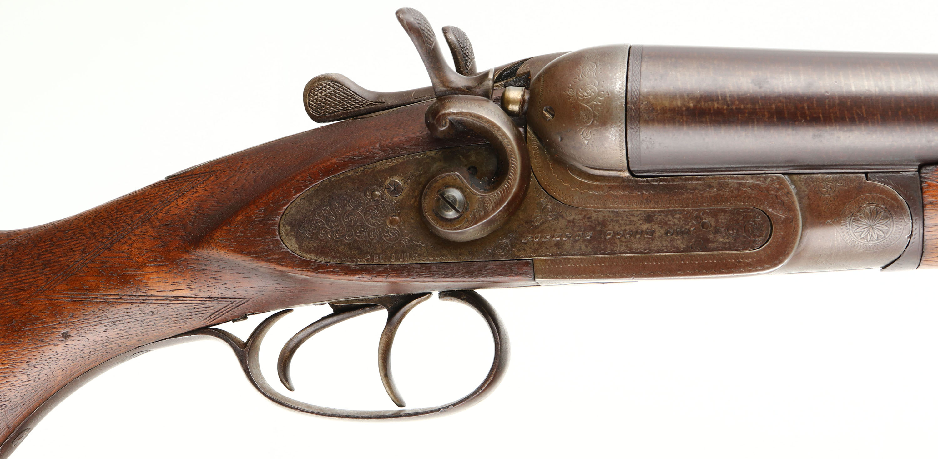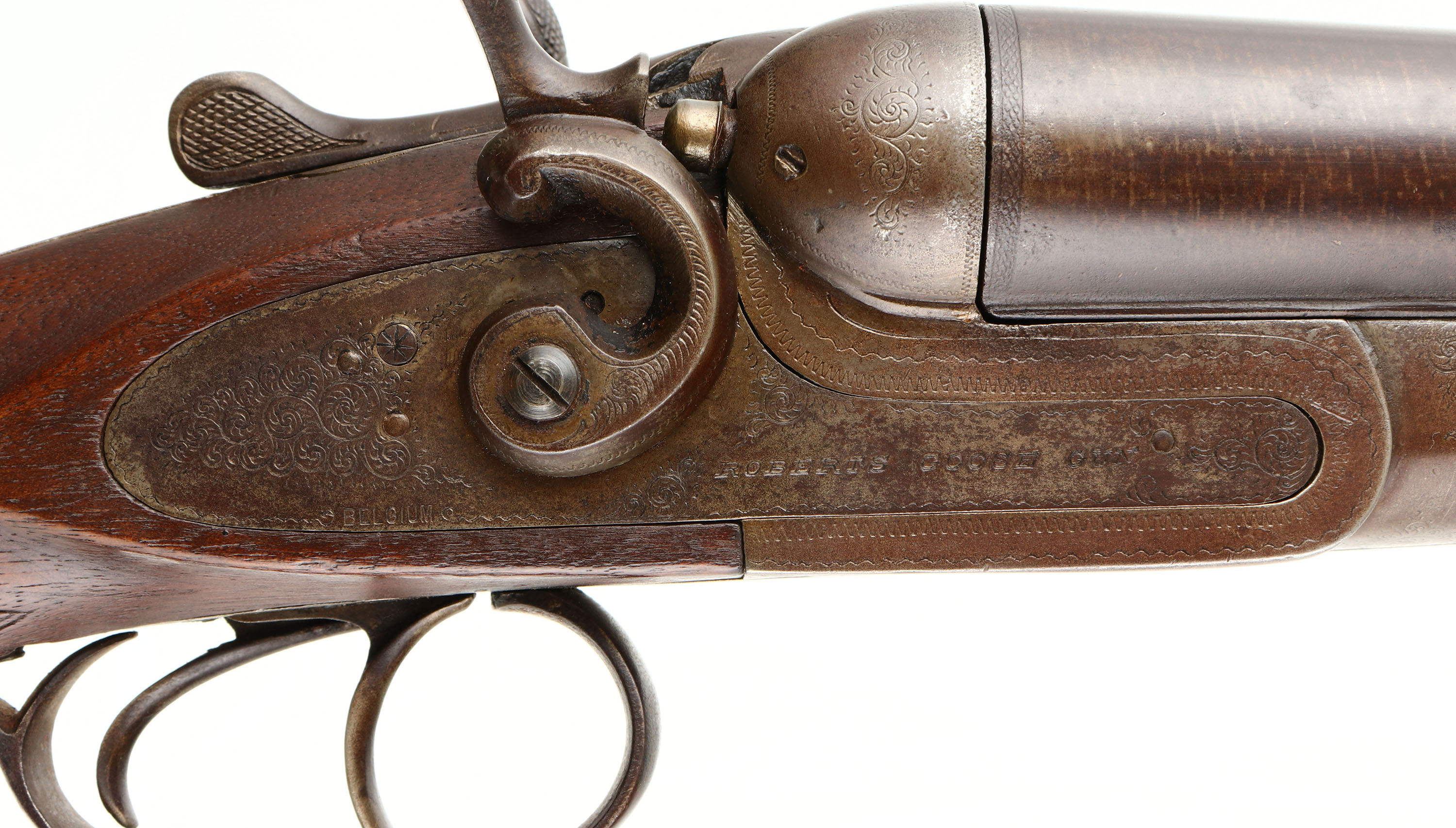 Roberts, Model: Goose Gun, Cal: 8 Ga, MFG: 1893-97, S/N: 2010, Break SxS Shotgun, 36'' damascus barrels. The checkered flat knob semi-pistol grip wood stock is very good with checkering wear, light nicks, dings, & wear from use/age, different color wood star embedded in left & right side of stock. The metal on the barrel has toned to a brown patina with remnants of the damascus pattern, the metal on the receiver has toned to a light brown patina with spots of gun metal gray. Left & right side of receiver is marked ''ROBERTS GOOSE GUN'', ''BELGIUM'', all side of the receiver is marked with nice ornamental engravings. Bores are very good, left bore has light roughness, right bore has roughness & light pitting. Barrel rib holds a bead front sight. Stock carries a grooved hard rubber buttplate. Lockup has a slight gap between barrels & recover & has small amount of play. LOP: 15'', DAH: 3 1/8'', DAC: 1 3/4''. Damascus barrels are not safe to shoot smokeless loads or steel shot out of. Antique No FFL Req. - Value: 2000 to 4000