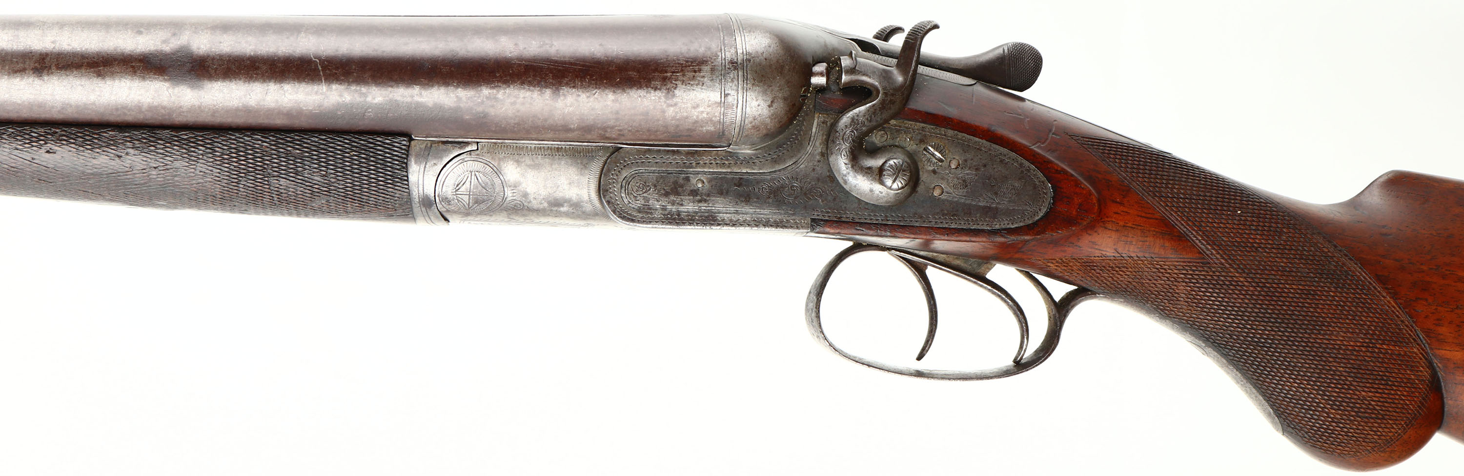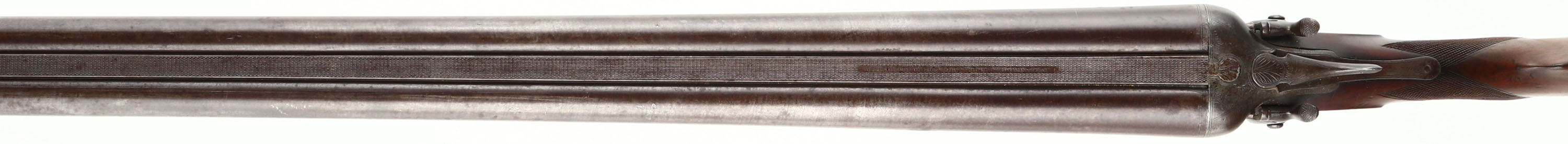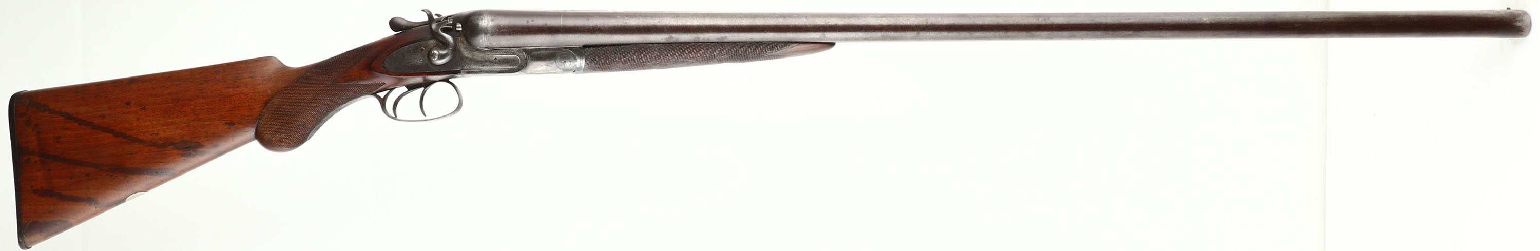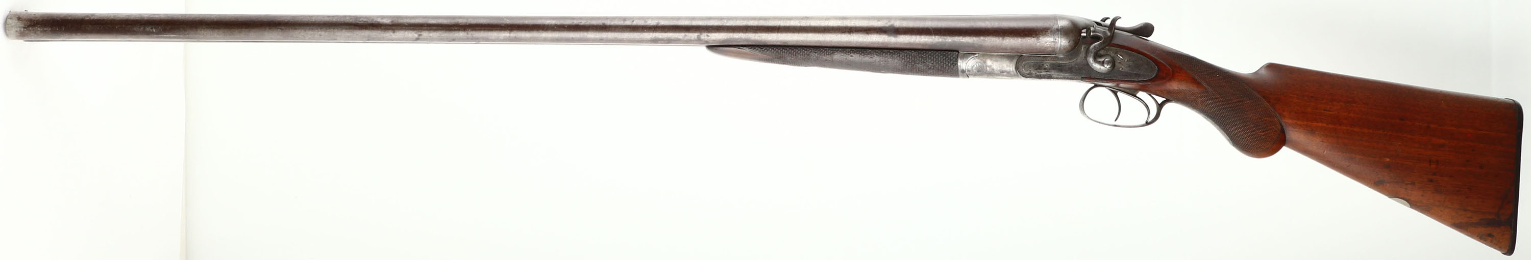 J.P. Clabrough & Bros, 8 Ga, MFG: 1904-25, S/N: 174, Break SxS Shotgun, 35 3/4'' Damascus barrels. The checkered round knob semi-pistol grip wood sock is very good with light nicks, dings, dents, & wear from use/age, three streak stains on right side of stock, silver pendent in belly of stock. The metal on the barrel has toned to a brown patina with faint remnants of the damascus pattern remaining, the receiver was left in the white & has brown/gray patina. Left & right side of the receiver is marked with ornamental engravings with a scene of game birds, top & bottom of receiver has ornamental engravings. Bores are very good with roughness in left barrel. Barrel rib carries a bead front sight. Stock holds a checkered hard rubber plate that's marked ''CLABROUGH'S DUCK & QUAIL GUN'', ''TRADE-MARK'', with a picture of a hunting dog with a duck in its mouth. Lockup is tight with no play. LOP: 14 1/2'', DAH: 2 7/8'', DAC: 1 5/8''. Damascus barrels are not safe to shoot smokeless loads or steel shot out of. FFL or C&R Req. - Value: 1500 to 3500