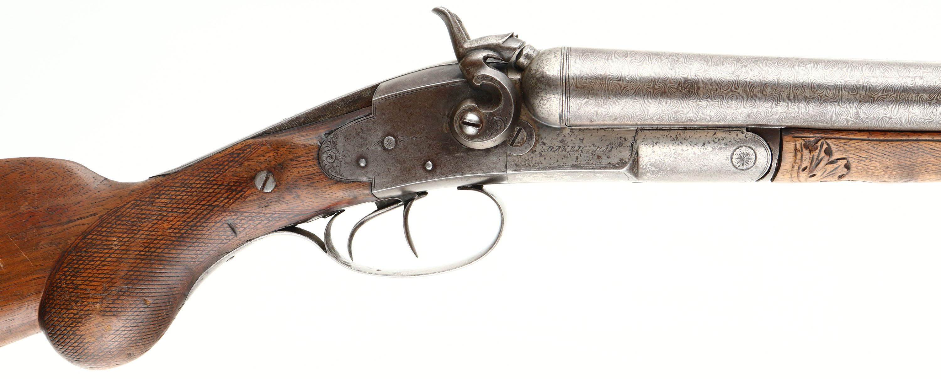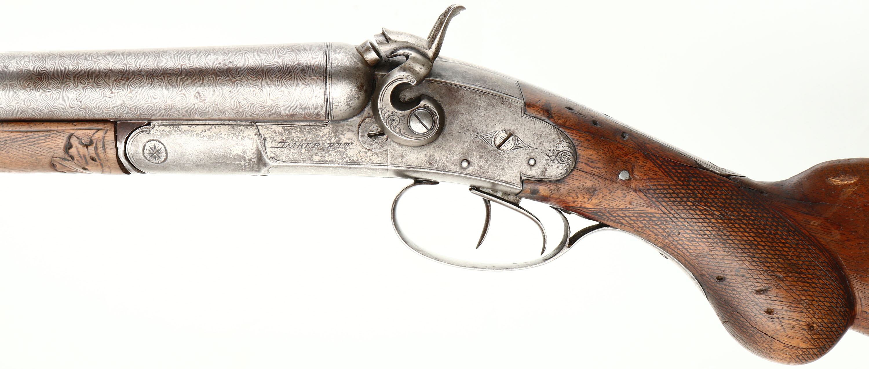 L.C. Smith Maker of Baker Gun, Model: Maker B Grade, 12 Ga, MFG: 1884-88, S/N: 7000B, Break SxS Shotgun, 30'' Damascus barrels. The checkered Semi-pistol grip wood stock is good, stock has small nicks, dings, dents, & wear from use/age, checkering has been well worn but still present, 4'' crack on top of wrist left side, emanating from the receiver, small chunk of stock missing on right side of stock on top of wrist, small chip at toe of stock, buttplate comes off wood near toe. The barrels has a gun metal gray with brown patina, rust speckling & damascus pattern, the receiver is a gun metal gray with gray/brown patina. Left & right side of receiver is marked ''BAKER PAT'' with some light ornamental engravings, top of barrel rib is marked ''L . C . SMITH MAKER OF BAKER GUN SYRACUSE N.Y. DAMASCUS STEEL''. Bore is good with roughness & light pitting. Barrel rib holds a front bead sight. Stock carries a steel buttplate with brown patina. Lockup is tight & has no play. LOP: 14 1/2'', DAH: 3 1/4'', DAC: 2''. Damascus barrels are not safe to shoot smokeless loads or steel shot out of. Antique No FFL Req. - Value: 300 to 600