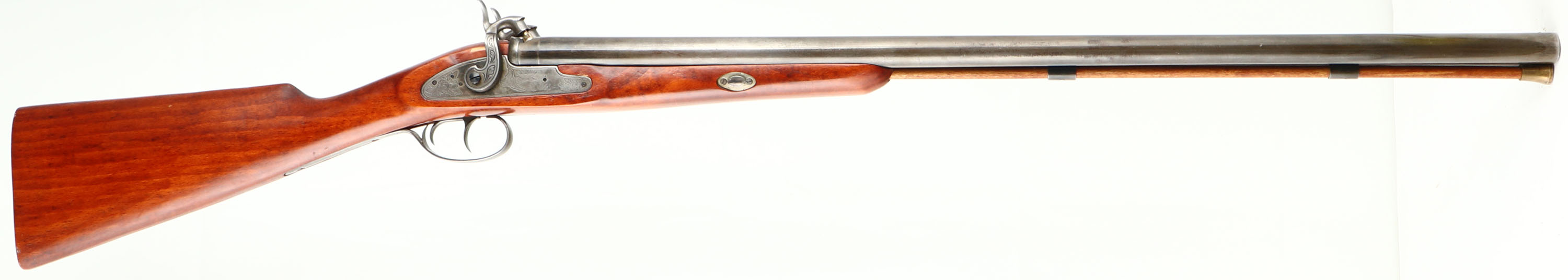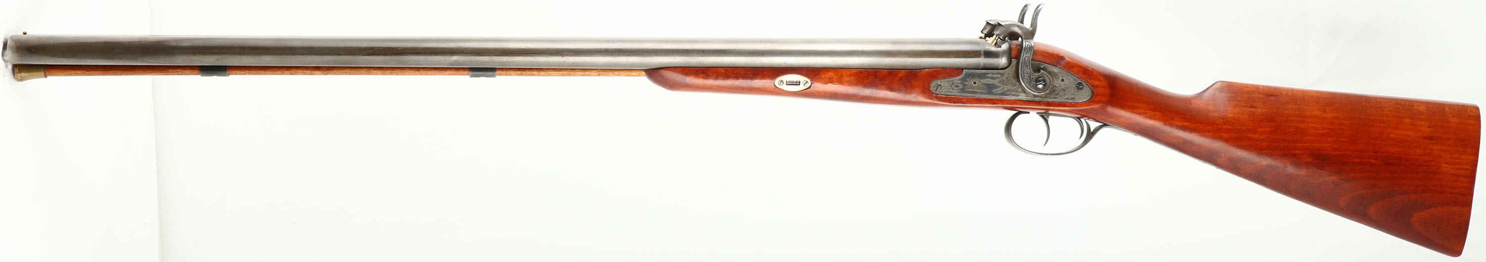 Connecticut Valley Arms, Muzzleloader Shotgun, CAL: 12GA, MFG: 1980's, SN: 16740, Blackpowder Percussion Shotgun, 28'' barrels. The original straight grip wood stock is excellent. There are contusions & handling marks to the finish. The metal blue finish has mostly toned to a brown/gray patina, with remnants of original blue. Both sides of the receiver display a simple waterfowl engraving, with floral accents. Bores are excellent. Solid rib holds a single front bead. No buttplate. LOP: 13 5/8''. Blackpowder, No FFL Req. - Value: 100 to 250