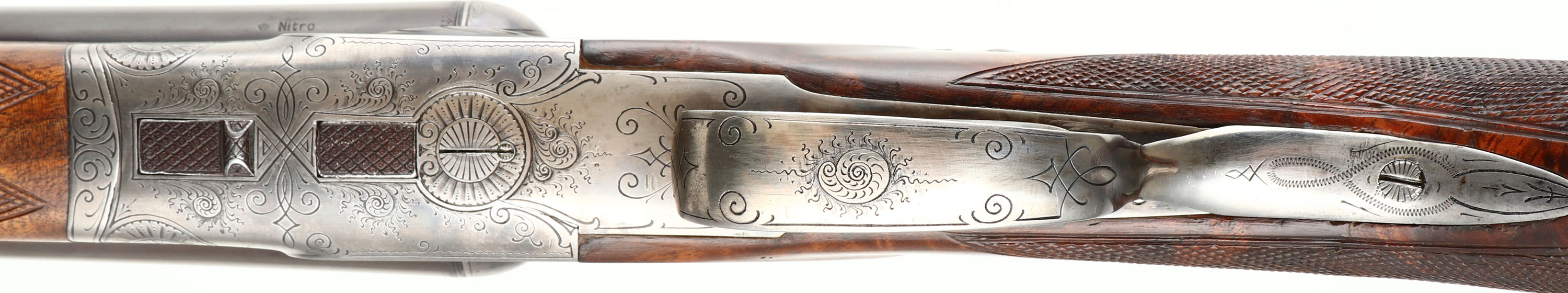 H. Barella, German 3-Barrel Drilling, CAL: 16x16x7mm, MFG: N/A, SN: 2033, Break Action Combo Gun, 26 3/4'' barrels. The tops of the barrels have a roll stamp that reads in a circular fashion ''KRUPP STAHL'', with an accent design in the middle. The sides of the barrels next to the receiver are marked ''NITRO'', with proof marks. The original fancy checkered & capped pistol grip stock with beaded cheek & pointed forend are excellent. There are handling marks to the finish & a small chip fill at the toe. The stock has beautiful figure, with feathered & rippled grain patterns. There is a blank small gold oval nameplate behind the rear sling loop. The metal blue finish on the barrels rates 95%, slightly toned plum. The receiver, break lever, trigger guard, forend break lever & screws all display simple ornamental & accent pattern engraving. The receiver is case-hardened, mostly worn to metal gray, but retains faint case-colors in protected areas. Bores are excellent, with visible light wear. The matted barrel rib holds a pair of folding leaf rear sights & a brass blade front sight. The first flip-up sight can be utilized by pushing the lever forward on the upper tang & the second rear sight has to be manually flipped. Factory sling loops present. Stock carries a grooved plastic buttplate. A beautiful hand crafted high condition German Drilling. LOP: 14'' to front trigger, DAH: 2'', DAC: 1 1/4''.* FFL or C&R Req. - Value: 2000 to 3000