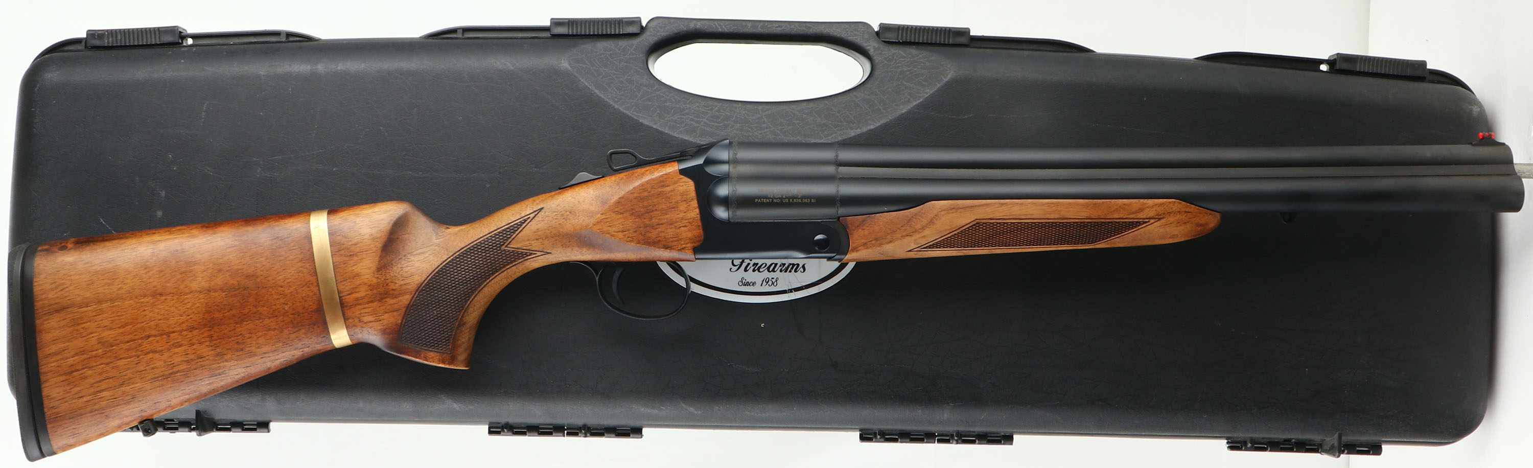 CASED NEW Chiappa, Model Triple Threat, CAL: 12 GA, MFG: Modern, SN: TC01736, Break Action SxS+ Shotgun, 18 1/2'' barrels. The original checkered & flat pistol grip walnut stocks are mint, having a hand oiled finish. Decorative brass band around stock is unusual, but factory standard. The original metal finishes are mint. Bores are mint, with screw in chokes. Comes with two additional chokes. Extractor. The top barrel holds a fiber optic front sight. Single non-selective mechanical reset single trigger system. Manual Safety. Sling studs. Buttstock carries a solid recoil pad. LOP: 14 1/4'' overpad. Comes in its original hard case, with packaging, extra chokes, choke tool & 1/4'' ''T'' handle allen wrench. NOS, gun store inventory. A new & really cool self defense or multi use shotgun. MSRP: $2,097.00. FFL Req. - Value: 1000 to 2100