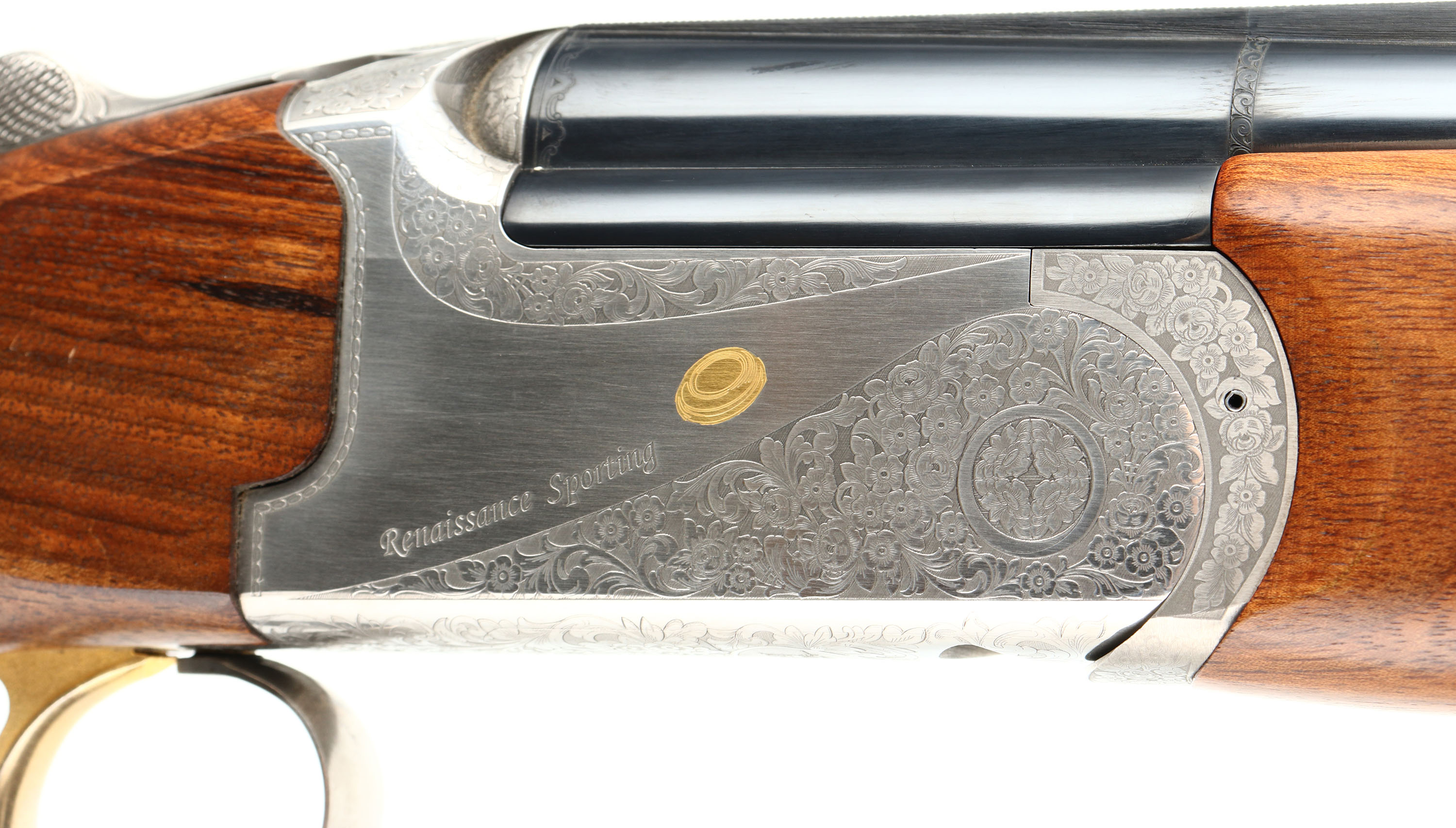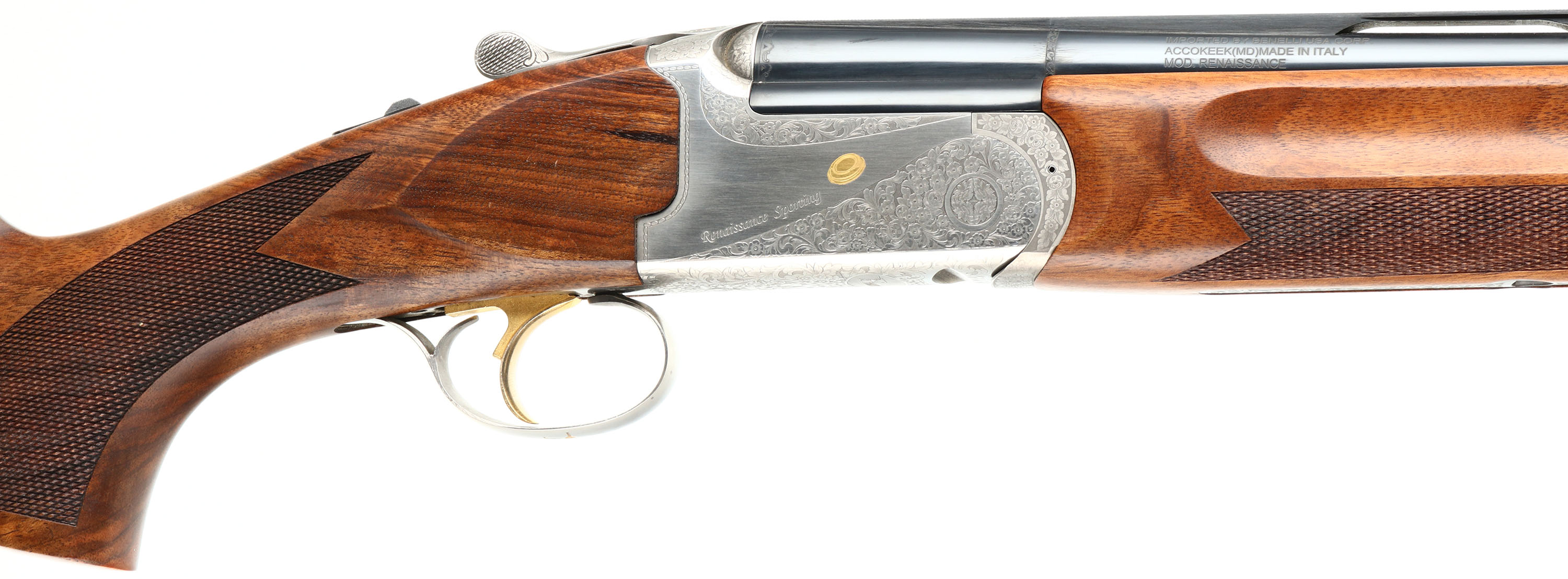 CASED Franchi (Benelli), Model Renaissance Sporting, CAL: 20 GA, MFG: Modern, SN: TB00085, Break Action O/U shotgun, 30'' ported barrels with extended, knurled choke tubes for easy fitting & removal. Franchi marketed this shotgun by saying: Its balance & swing blend in a way that makes the Renaissance Sporting an appealing over & under for clay target shooters at every level. The Renaissance Sporting combines the tradition & technology of Franchi shotguns. The receiver is enhanced with scroll engraving and gold embellishments. The stock, cut from highly figured select walnut and featuring cut checkering, sports a traditional oil finish to complement the beautiful grain pattern of the wood. The stock is further enhanced with an adjustable comb & Franchi's patented, recoil-reducing Twin Shock Absorber system. The original checkered & flat pistol grip wood stocks are excellent, as is the original finish. There is a bit of haze on the right side of stock due to storage. The metal blue finish rates 99% overall. The satin silver finish on receiver is excellent. Bores are excellent. The ventilated & matted rib holds a fiber optic front rail. Weighing in at 8 pounds, this Franchi shotgun uses an extra-strong, stainless steel box-lock action capable of handling a steady diet of high-brass target loads. Gold trigger. Comes in its original hard plastic case, with extra choke, choke tool, booklet & hang tags. An excellent overall & fantastic quality sporting shotgun. LOP: 14 1/2'' overpad, DAH: 1 7/8'', DAC: 1 3/8''. FFL Req. - Value: 1000 to 1800