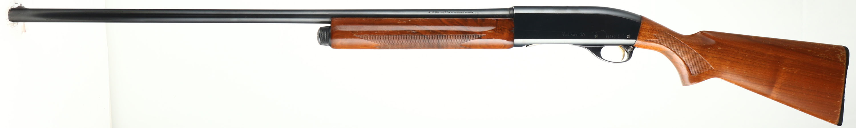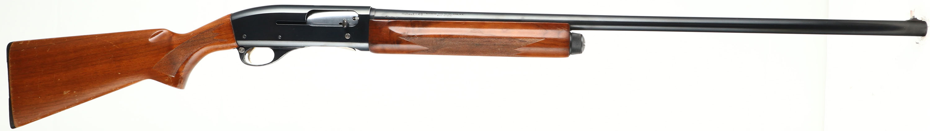Remington Model Mohawk-48, 12 GA, MFG: 1972, SN: 5268141, Semi-Auto Shotgun, Choke: Full, 30'' Barrel. The original checkered & flat pistol grip wood stocks are excellent, with minor scrapes, contusions & some edge shipping or flaking to the original factory finish. The metal blue finish rates 99% on the barrel, 95% on the receiver. Bore is excellent. Single front bead. Buttstock carries a Remington marked buttplate. Gold trigger. LOP: 14''. FFL or CCR Req - Value: 350 to 700