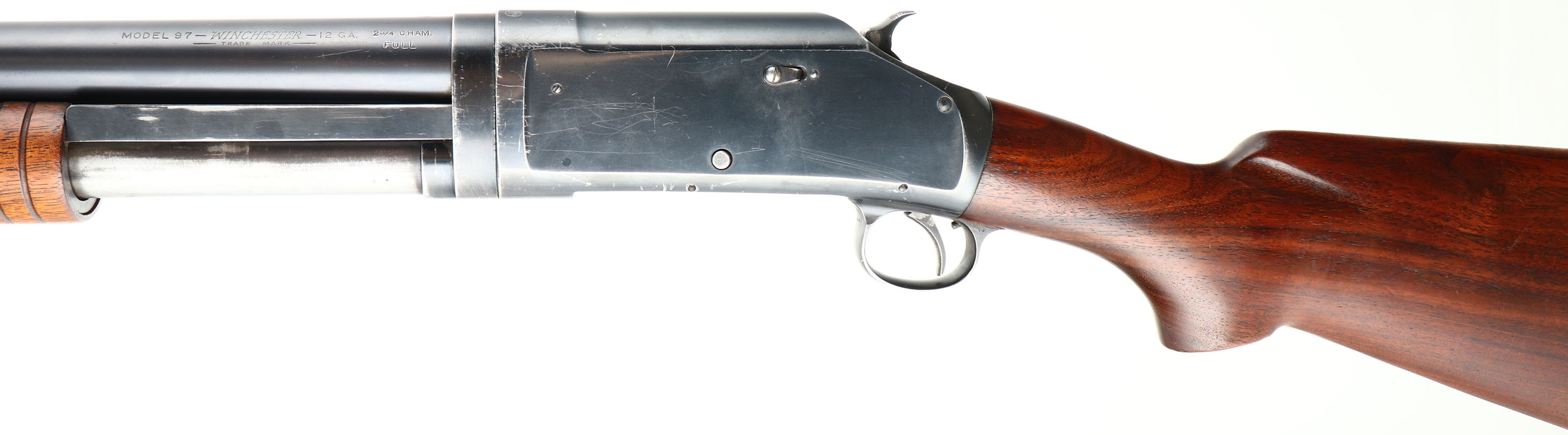 Winchester, Model 97 Take-Down, CAL: 12 GA, MFG: 1941, SN: 921300, Pump Action Shotgun, Choke: Full, 32'' barrel. The original flat knob pistol grip stocks are excellent, with minor handling marks to the original finish. The original metal finish is 95% on the barrel, 90% on the receiver & 30% on the mag tube. Bore is excellent. Barrel holds a single front bead. Missing one small filler screw at the front of the mag tube. Stock carries a Winchester plastic buttplate. LOP 13 5/8''. FFL or C&R Req. - Value: 500 to 1000