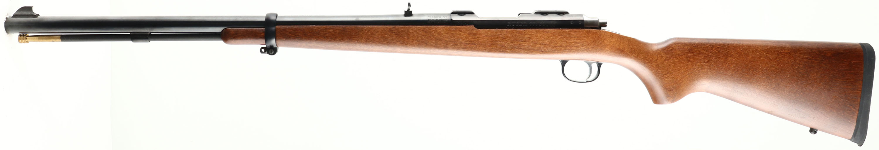BOXED Ruger, 77/50 Muzzle Loader, Cal. 50 Black Powder, Bolt Action, Mfg: modern, SN: 70-19202, 22 1/4'' barrel, wood stock is mint, factory blue finish is 99%, Bore is minty, has factory sights with rear sight folding, has Ruger scope rings sealed in original package, box has lock, rings & paperwork. NO FFL Req. - Value: 300 to 600