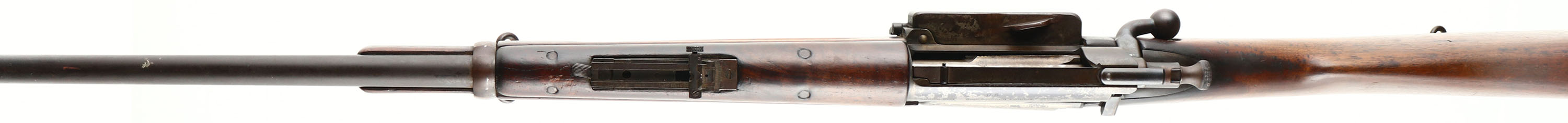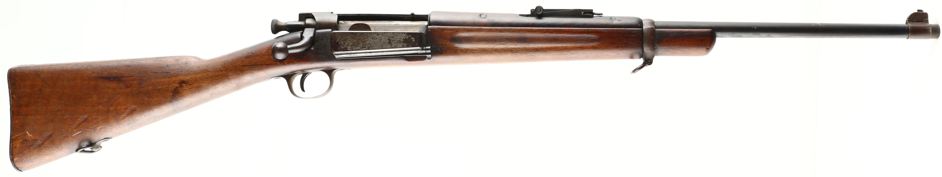 Springfield Armory, Model: 1898 Krag, Cal: .30-40 Krag, MFG: 1900, S/N: 259563, Bolt action rifle, 22 1/4'' Barrel. The cut down straight wrist wood stock is very good, stock has nicks, dings, dents, scratches, & wear from use/age, plug fill in where the hole for the cleaning used to be, small circle carved out of right side of stock for bolt handle, inlaid pearl colored circle on left side of stock above trigger, no visible cartouches, upper handguard has four hairline cracks Infront of rear sight block, two of them appear to have been repaired. The metal finish on the barrel rates 75% with wear, scratches, & patina, the metal finish on the receiver rates 45% with most areas worn to a gun metal gray. Left side of the receiver is marked ''U.S.'', ''MODEL 1898 SPRINGFIELD ARMORY'', & S/N. Bolt hand has been bent backwards, safety is missing. Bore is excellent, bright & mirror like. Blade on ramp front sight with, tangent/ladder V-notch rear sight marked 1 to 4 on base & 4 to 20 on ladder. Steel trapdoor buttplate with light rust & brown patina, noting inside trapdoor. Bottom sling swivels. FFL or C&R Req. - Value: 200 to 400