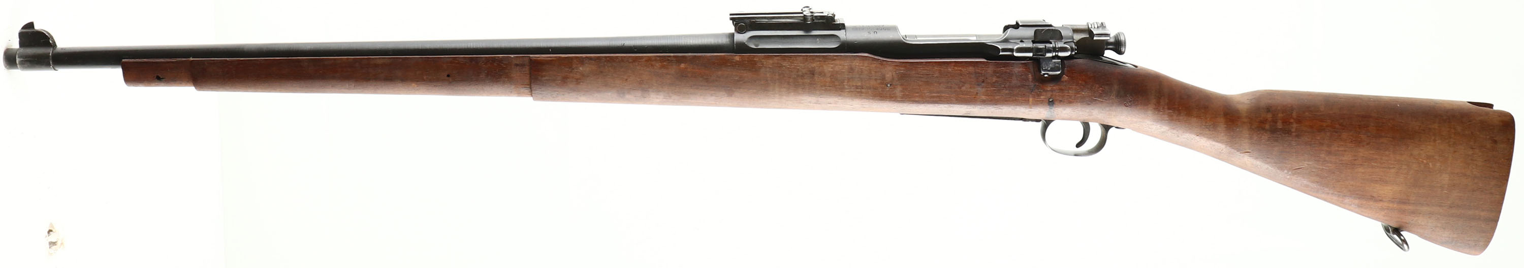 Rock Island Arsenal, Model: 1903, Cal: 30-06, MFG:1920. S/N: 385073. Bolt Action Rifle. 23 5/8'' Round Barrel. The straight wrist wooden stock is good, stock has been sanded down & no original finish remains, has light scratches, dings, dents, chips & wear from use/age, small chip in stock in top of stock by Butt plate, left side of stock above trigger is marked with us army ordnance crest & ''FJA'', ''P'' in circle marked into bottom of wrist of stock, bottom of stock in front of magazine is marked, ''8'' in circle, ''8'' in triangle, ''5'' in square & ''10'' in square, cartouches, stock is missing the upper handguard, barrel bands, & bayonet lug. The metal finish rates 80% overall with small spots of thinned bluing. Top of receiver is marked, ''U.S.'', ''ROCK ISLAND'', ''ARSENAL'', ''MODEL 1903'', S/N, Top end of barrel is marked, ''S A'', flaming bomb, ''7-28'', Remington made bolt. Bore is very good, bright with light roughness, 4 groove rifling. Blade front sight with, windage & elevation adjustable U notch ladder rear sight, marked 4 to 27 on top. Missing Butt plate. Rear bottom sling swivel. This would make a nice project rifle to compete into a full rifle with nothing being cut or destroyed. FFL or C&R Req. - Value: 400 to 800