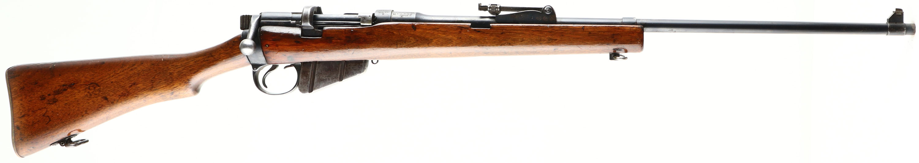 Ishapore, Model No1 Mk3*, Cal: .303 British, MFG: 1942, S/N: 39609Z, Bolt action rifle, 25 1/4'' Barrel. The cut down semi-Pistol grip wood stock is good, stock appears to have a high gloss finishes added overtop it, faint cartouche on right side of stock by cheek. The metal finish rates 50% overall with spots of thinning & patina. Left side of wrist band is marked ''NOIMKIII*'', ''FR42'', receiver band is marked with Ishipora proof mark, ''ENGLAND'', & S/N, Barrel is marked with proof marks. Bore is excellent. Blade front sight with tangent U-notch rear sight marked 2 to 20. Brass trapdoor butt plate. Bottom sling swivels. FFL or C&R Req. - Value: 150 to 300