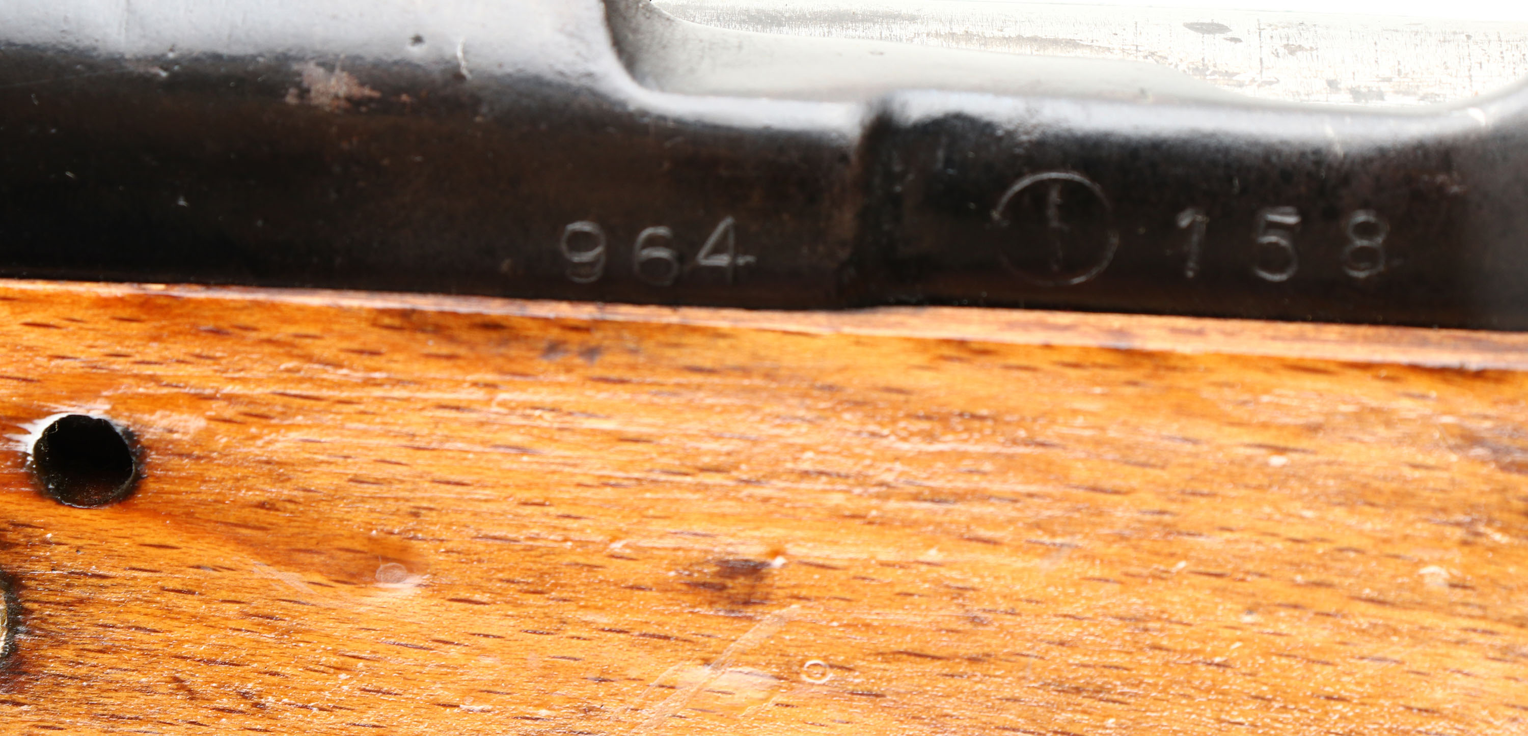 RARE!!! & EARLY!!!, Yokosuka Naval Arsenal, Type 99 Navy Special. Cal: 7.7x58mm Arisaka, MFG: 1944, S/N: 158, Bolt action Rifle, 26 1/2'' barrel. These rifles were made by the Japanese navy because at this time all the rifle arsenals were tied up with making rifles for the army, & with shortages going around of materials & factorys, there was no extra capacity to make rifles for the navy, so they took their own factory's at the ship yard & came up with a type 99 that was almost entirely made of cast iron, other than the barrel & bolt body, while normally a cast iron receiver would not last more than a handful of rounds before exploding, they achieved a ''functioning'' rifle by having a barrel extension so that the locking recesses for the locking logs are part of the barrel, not the receiver, so the receiver only acts to hold everything in place & not a pressure bearing component. Production numbers vary wildly on these, collectors have said up to 17,000 to as little as 6,000, but either way they are a rare & very collectable weapon today in any condition. Even with these rifles being made with the intention of using full power military rounds unlike the trainers, collectors do not recommend shooting them from their scarcity and with the fragile receivers. The semi-pistol grip wood stock is good, stock has been sanded down, heavily in areas & re-finished, metal is proud to wood in areas,. The metal black paint finish which is factory they were painted not blued, rates 80% on the barrel with a few spots of wear & 60% on the receiver with spots of wear & thinning. Left side of receiver is marked with the part # ''964'', the Yokosuka Naval Arsenal stamp, & S/N, top of receiver has the navy Anchor mark, & faint remnants of ''9 9 Shiki Toku'' marking or ''Special Type 99'' in English, top of barrel is marked with the Yokosuka Naval Arsenal stamp, ''964'', ''A - 93'', bolt, barrel bands, trigger guard, & butt plate are all marked with the ''964'' part #, the Safety knob on the bolt has a piece broken off but all other parts of the bolt are precent & in working order, missing one screw for front barrel band, floor plate/trigger guard screws appear to be modern replacement but with the hobbled together nature of these rifle it could be original, paint appears to match. Bore is very good, bright with light roughness. Barleycorn front sight with protective wings, Tangent Aperture rear sight marked 3 to 15. Cast iron Butt plate with black paint finish.no cleaning rod or sling mounts were made for these rifles. A excellent & rare find that's sadly been sanded down and possible has replaced parts but its still a good collectors piece. FFL or C&R Req. - Value: 600 to 2000