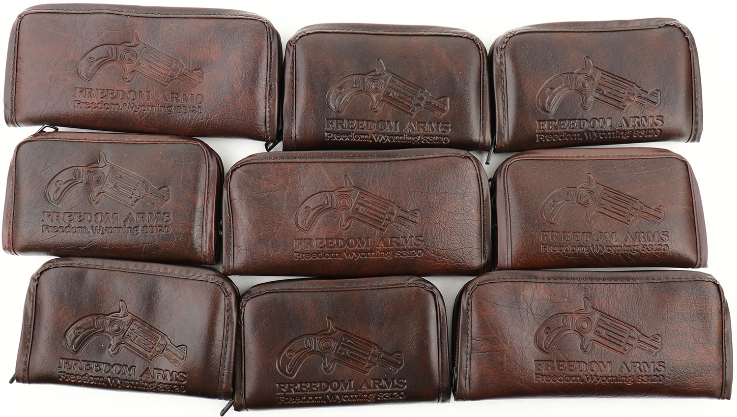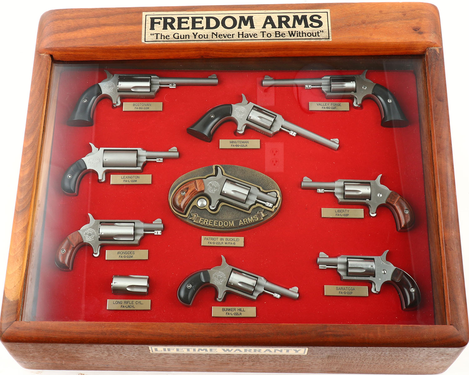 RARE CASED DEALER SET, Freedom Arms, ''The Gun You Never Have To Be Without'' 9 Casull's Improvement Mini Revolver set, plus extra Cylinder. This is a rare opportunity to purchase a complete 1980's Freedom Arms wood ''Dealer'' counter display / merchandiser, with nine original & mint to near mint Casull's Improved mini revolvers (one with mounting belt buckle), an extra LR cylinder, 9 original zipper pouches, & complete paperwork. The revolvers included are (3) setup for .22 Mag with 4 rd cylinders, & (6) which are .22 LR or Short with 5 Rd cylinders. The models have barrel lengths between 1 1/8'' to 3''. 5 revolvers carry their original black plastic grips, while the other 4 carry original wood grips. The revolvers are constructed of stainless steel, & carry serrated triggers & original front sights. The set include models: Bostonian .22 Mag 3'', Lexington .22 Mag 1 3/4'', Ironsides .22 Mag 1 1/8'', Minuteman .22 LR 3'', Patriot (mounted in buckle) .22 LR 1 1/8'', Bunker Hill .22 LR 1 3/4'', Valley Forge .22(P) LR 3'', Liberty .22(P) LR 1 3/4'' & Saratoga .22(P) LR 1 1/8''. All are mint to near mint (mild handling marks) & come displayed on they original red display insert, within the original wood & glass key locking display case. Under the display board is the space where the 9 zippered cases are stored. These counter display sets were only made available to dealers to help facilitate sales. Freedom Arms is a Freedom, Wyoming based firearm manufacturing company, known for producing powerful single-action revolvers. The company was founded in 1978 by Wayne Baker & Dick Casull to produce the Mini-Revolver, then later a revolver chambered in Casull's powerful .454 Casull revolver cartridge. Freedom Arms' first offering was a 5-shot mini revolver in .22 LR known as ''The Patriot''. It was later offered in .22 Short & .22 Winchester Rimfire Magnum. A belt buckle holster version was patented by Richard J. ''Dick'' Casull to accommodate the small revolver. A Boot Pistol model was available with a longer barrel. A 4-shot mag mini revolver was also produced by Freedom Arms. All of which are included in this offering. Production of mini-revolvers by Freedom Arms ceased in 1990 when the mini-revolver design was sold to North American Arms. These are real mini revolvers, which fire real production ammo & carry their own Serial Number. These are not toys & do require an FFL background check for each revolver. These original Freedom Arms mini revolvers have become quite collectible & this set of nine in their original display case & in near new condition is very rare & very collectible. FFL Req. - Value: 3000 to 5000