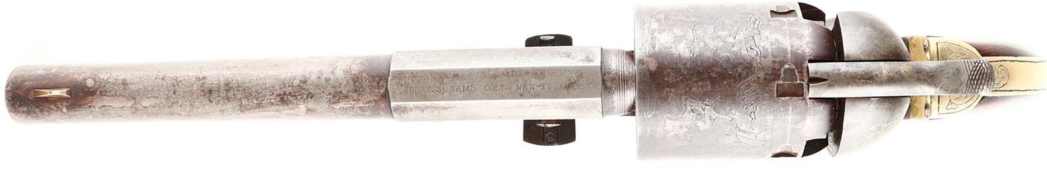 DESIRABLE & ENGRAVED, Colt, 3rd Model Dragoon, CAL: .44, MFG: 1853 SN: 13579, Single Action Revolver, 7 1/2'' barrel. Colt only produced 10,500 of these pistols from 1851-61, with the serial number range being from 10,200 - 19,600. This particular example carries all matching serial numbers. The wood grips are very good, as having been sanded & refinished leaving the metal proud to the wood. They display minor contusions & handling marks. The metal finish has worn to a mix of metal gray & brown patina. The brass trigger guard/grip has been polished & cleaned, with a thin aged patina. The frame, barrel housing, backstrap & trigger guard/grip all display fantastic custom, ornamental scroll hand engraving. The cylinder displays the Texas Ranger & Indian fight scene. Bore is excellent. Barrel has brass blade front sight. A rarely seen Dragoon & one with strong eye appeal. Antique, No FFL Req. - Value: 7500 to 15000