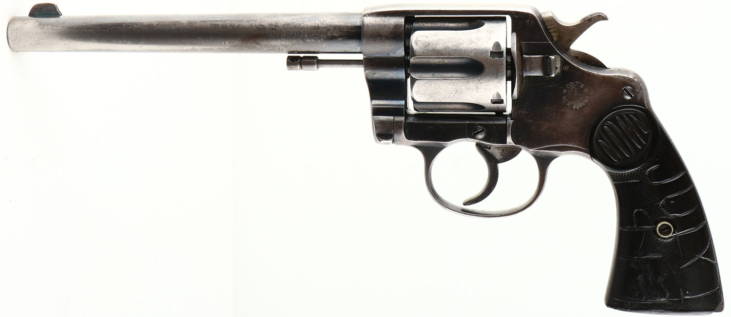 Colt, New Service, CAL: 44 Cal. (44-40), MFG: 1904, SN: 12113, Double Action Revolver, 7 1/2'' barrel. The checkered on the ''COLT'' plastic grips has worn mostly smooth & the initials ''SWS'' are carved into the right grip & the date ''JULY 1919'' into the left grip. The bottom corners of each grip have a 1/4'' missing chip. The original metal blue finish has worn mostly gun metal gray, with thinned blue & a thin brown patina remain in frame & cylinder on protected areas. Bore remains very good & bright. The barrel holds a blade front sight. Butt missing lanyard swivel. Action & cylinder are tight & timing functions properly. An original, well used & loved New Service with lots of stories to tell & lots of quality life remaining. FFL or C&R Req. - Value: 400 to 800