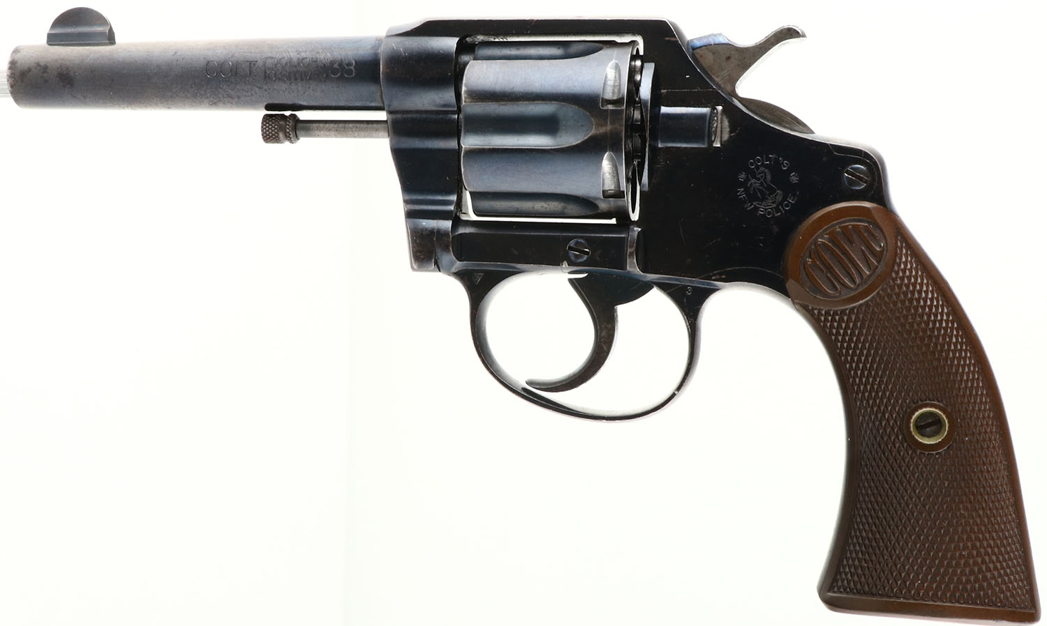 Colt, Police Positive, New Police, CAL: 38, MFG: 1906, SN: 6895, Double Action Revolver, 4'' barrel. The top of the barrel is marked in two lines ''COLT'S PT F.A. MFG. CO. HARTFORD CT. U.S.A.'', ''PAT'D AUG.5.1884 JUNE 5.1900 JULY 4 1905''. The left side of the barrel is marked ''COLT POLICE POSITIVE 38''. The left side of the frame is marked in a circle ''COLTS NEW POLICE'' with the Rampant Colt logo in the center. The full SN can be found on the frame & cylinder swing gate. The original ''Colt'' marked checkered hard rubber grips are excellent, but toning brown with age. The metal blue finish rates 85% overall. Bore is excellent. The barrel holds a half moon blade front sight. The Police Positive was very successful, along with the Colt Official Police. The two dominated the law enforcement firearms market in the early 1900's. FFL or C&R Req. - Value: 400 to 800