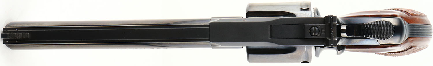 Colt, Python, CAL: 357 MAG, MFG: 1979, SN: V38222, Double Action Revolver, 6'' barrel. The Colt Python was introduced as a premium model in 1955, in caliber .357 Magnum. The Python is built on the large I-frame & has a reputation for accuracy, smooth trigger pull, & a tight cylinder lock-up. It has a 6-shot swing-out cylinder & was available in Python blue, Royal blue, Python nickel & Python stainless steel finishes. Some firearm collectors & writers have described the Python as ''the finest production revolver ever made''. It has a wide serrated target hammer, ventilated rib, & fully adjustable target quality rear sights. The left side of barrel is stamped in two lines ''PYTHON 357 * .357 MAGNUM CTG * ''. The Rampant Colt gold medallion, checkered walnut grips on this example are mint. The high polish blued finish is excellent, rating 99%, with a faint drag line. Bore is excellent, near mint. The satin finished top of the ventilated rib barrel holds a screw height adjusting ''U'' notch rear sight & front blade sight. This pistol is very collectible when found in this high of condition. FFL Req. - Value: 2200 to 3000