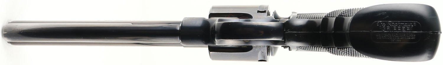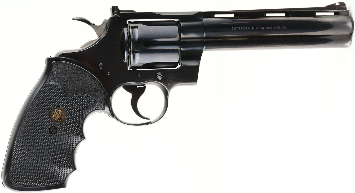 Colt, Python, CAL: 357 MAG, MFG: 1971, SN: E30211, Double Action Revolver, 6'' barrel. The Colt Python was introduced as a premium model in 1955, in caliber .357 Magnum. The Python is built on the large I-frame & has a reputation for accuracy, smooth trigger pull, & a tight cylinder lock-up. It has a 6-shot swing-out cylinder & was available in Python blue, Royal blue, Python nickel & Python stainless steel finishes. Some firearm collectors & writers have described the Python as ''the finest production revolver ever made''. It has a wide serrated target hammer, ventilated rib, & fully adjustable target quality rear sights. The left side of barrel is stamped in two lines ''PYTHON 357 * .357 MAGNUM CTG * ''. The upgraded gold logo medallion Pachmayr ''GRIPPER'' rubber grips are excellent. The high polish blued finish rates 90%, with holster wear at & around the muzzle, the cylinder & sides of the frame. Bore is excellent. The frame holds a screw height adjusting ''U'' notch rear sight & the ventilated rib holds a serrated front blade sight (missing orange insert). This pistol would be a great addition to a shooters collection. FFL Req. - Value: 1400 to 2000
